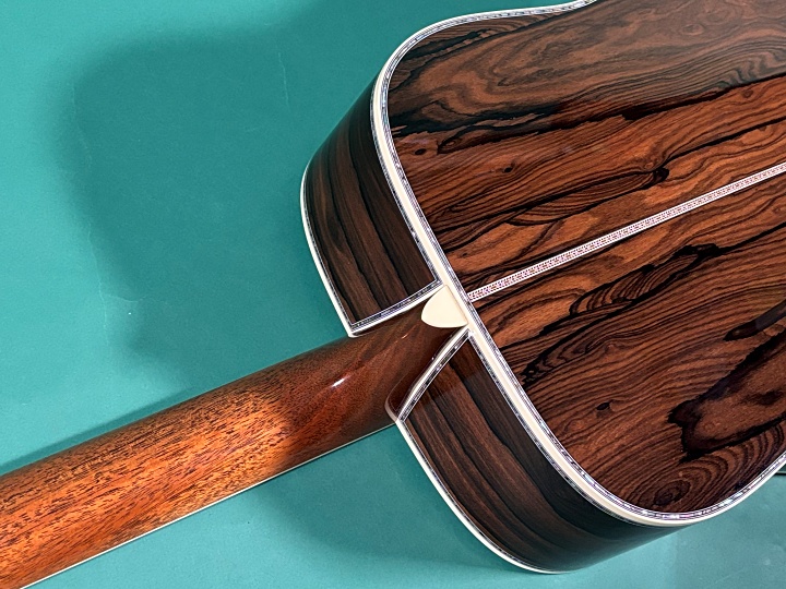 今回入荷したD-45には、プレミアムグレードの中から厳選されたアディロンダック・スプルース、サイド&バックにはエキゾチックな杢目が美しいプレミアムグレードのZiricote(ジリコテ)が採用されています。ジリコテは現在マーチン社のストックの中でも高級材のひとつで、カスタムオーダーのみ使用されています。ネックはジニュイン・マホガニー、指板およびブリッジはエボニー製で、ロングスロットサドル、ヘッドプレートにもジリコテが使用されています。