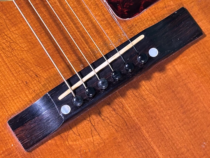 コンパクトなボディーは見た目LG-2と同じで、外観からは見分けが難しいですが、内部トップブレイシングがラダータイプがLG-1で、軽い鳴りが特徴です。