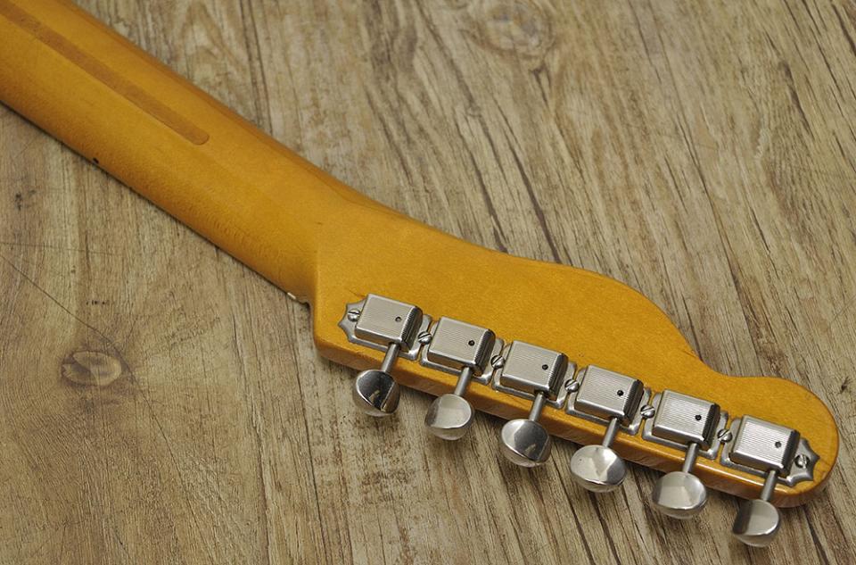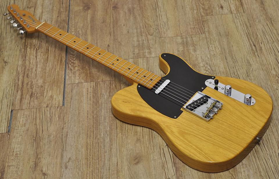 ボディはアッシュ材、ネックは1ピース・メイプル仕様。ブロンドフィニッシュの下から木目がうっすらと浮かび上がり、上品で落ち着いた風合いを持ちます。ハードウェアには当時の仕様を忠実に再現した**マイナスねじ(スロットスクリュー)**を採用し、ブラス製3連サドルやクロームプレートなど、50年代初期のディテールを正確に踏襲しています。