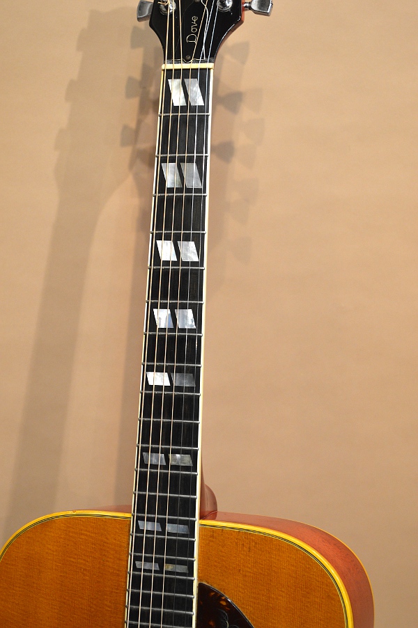 楽器のコンディションは年式なりのキズや使用感、経年感などありますが、弾く為の楽器としてはバッチリ調整が行き届いています。まず70年代ダヴの鬼門、PGはグズグズに崩壊するタイプではなく、良い状態を維持しています。60年代後半~78年頃までのDOVEのPGは、グズグズと崩壊してくるPGも多いですが、他社様の情報や弊社で過去に販売したDOVEの画像を検索してみると、崩壊するタイプと崩壊しないタイプがあったようですね。特に70年~72年頃のDOVEはこの崩壊しないタイプが多いようです。PGの柄は長年のピッキングに因りかなり薄くなっていますが、今後お使い頂くのには崩壊の心配もありません。また、不思議な事にこちらの個体、ネック横のサイド・ポジが入っていません。マジックで書いたような跡がうっすら残っていますが、、。まさかレフト・ハンド?と思い反対側も見てみましたが、こちらも無し。バインディング貼り直しも検討しましたが、その形跡も無いので、恐らくギブソンにありがちな凡ミスかと思われます。ボディー・トップにはそこそこ目立つキズもあり、バックにはバックル・キズが盛大に付いていますが、いずれのキズも極自然なキズばかりですので、50年以上前に作られた楽器として見て、気になる程のキズやダメージは無いかと思います。