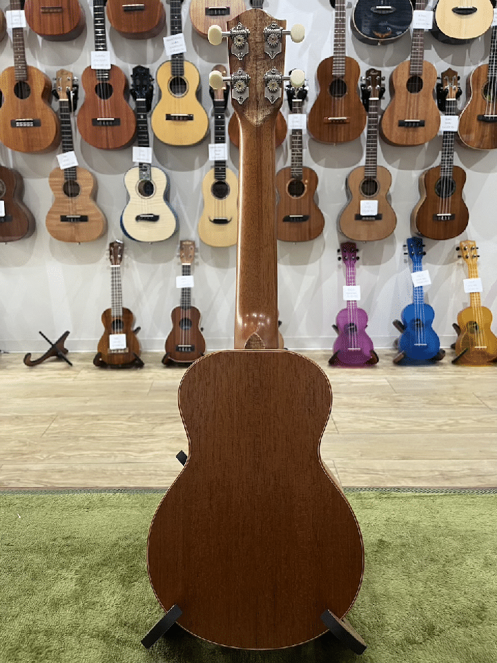 ウクレレ界の人気製作家トダギターズ戸田真次氏のコンサートウクレレです。戸田さんは1968年滋賀県生まれ、大阪ギタークラフトアカデミーを卒業後ESPに入社、98年に自身の出身地の滋賀県で工房を設立。以来、高品質でデザイン性に優れたギター、ウクレレで高い評価を得ています。また、その製作本数の少なさから入手困難な楽器としても知られています今回のモデルはホンデュラスマホガニーをボディ材に用いています。マホガニーは主にアフリカンマホガニーとホンデュラスマホガニーが用いられていますが、材料としてはホンジュラスマホガニーの方が高く評価されています。19世紀にホンジュラスマホガニーがその美しさと材料としての加工しやすさ、変化の少なさにより多用され資源が不足したときに、マホガニーに似ているアフリカのカヤ材をアフリカンマホガニーとして木材会社が売り出したのがアフリカンマホガニー誕生のきっかけです。なお、現在は共に枯渇し始めていて、自然保護の法律であるワシントン条約にて保護の対象になり、それに伴い値段も高騰しています。