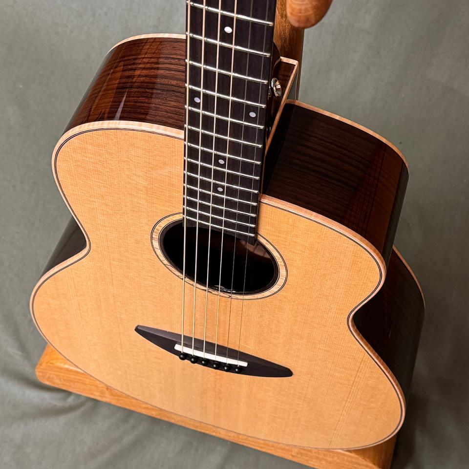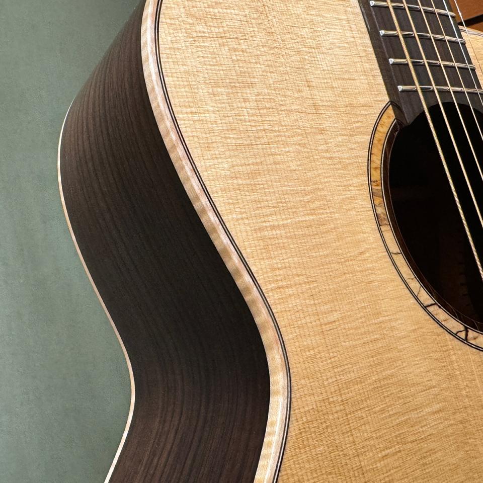 全面単板というだけでここまで変化してしまっていいのかというほど鳴ります。前期ロッドといわれることになると思いますが、ボディーバインディングのメイプルもこの価格では考えられないほど杢の美しいものを使用しています。ピックアップマイクを搭載したエレアコ仕様です。