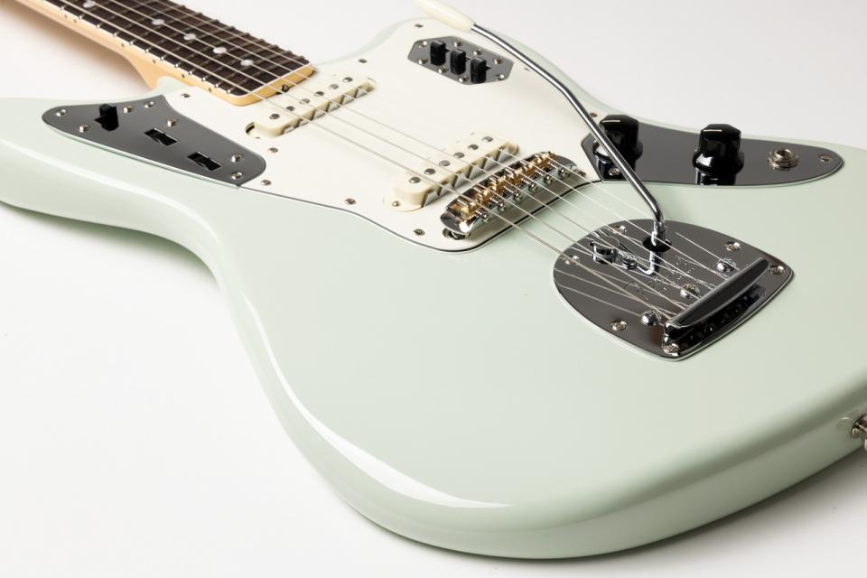 ネックにはバインディングが施された"C"シェイプを採用し、さらにミディアムジャンボフレットを搭載することで、軽いタッチでもスムーズな演奏が可能です。また、ブラス製スパイラルサドルと、このモデルのために特別に開発されたオリジナルピックアップの組み合わせにより、Jaguar特有のエッジの効いたクリーントーンの中にも温かみを感じられ、ドライブさせても輪郭がはっきりとした明瞭なサウンドを実現。彼女の特徴的なギタートーンを忠実に再現できる仕様となっています。