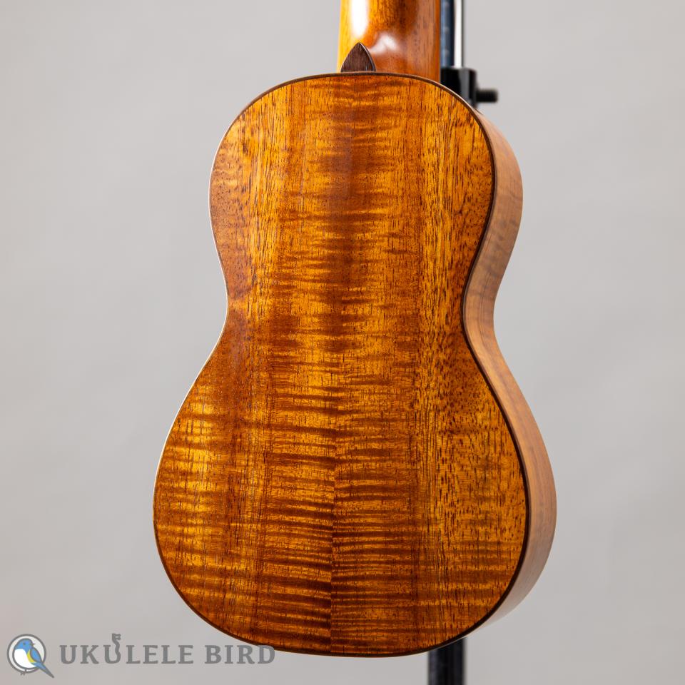 ボディトップとサイド&バックにカーリーの入ったハワイアンコア、ブリッジと指板にエボニー、ヘッドプレートにローズウッドを使用し、ウレタン塗装の下塗り上に荏胡麻油で半艶状に最終仕上げが施され、美い外観を呈しています。