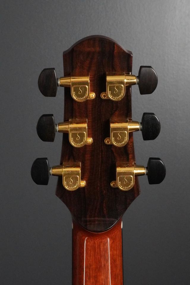 トラスロッドカバーはハワイアンコアが使われ、チューナーはゴールドのシャーラーでエボニーボタン、ヘッドや指板にインレイがないシンプルな仕様ですが、それぞれの木材の色味に対比があって見飽きないルックスとなり、これこそがサーゲイの持ち味で、ウッディな雰囲気が漂う上品なギターに仕上がっています。