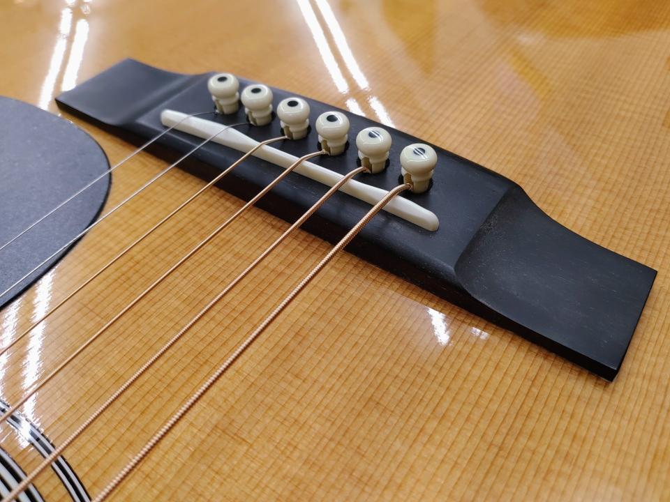 光に当てれば判別できる程度の細かな傷はありますが、およそ20年前の個体としてはとてもキレイなコンディションです。ピックガードは保護シールがそのままと思われ、その上であまり弾き傷も見られません。ネック状態良好でトラスロッドの可動も問題なく、現状にて弦高は12フレット6弦で約2.6mm、1弦で約2.1mm。ブリッジサドルの高さは適正で3mm以上の余裕有り。フレットは若干痕がある程度でほとんど減りはなく、全体的にあまり弾かれていた雰囲気がありません。