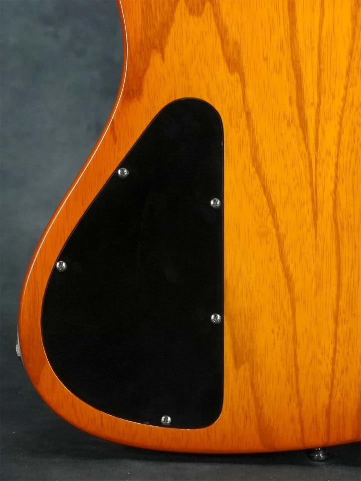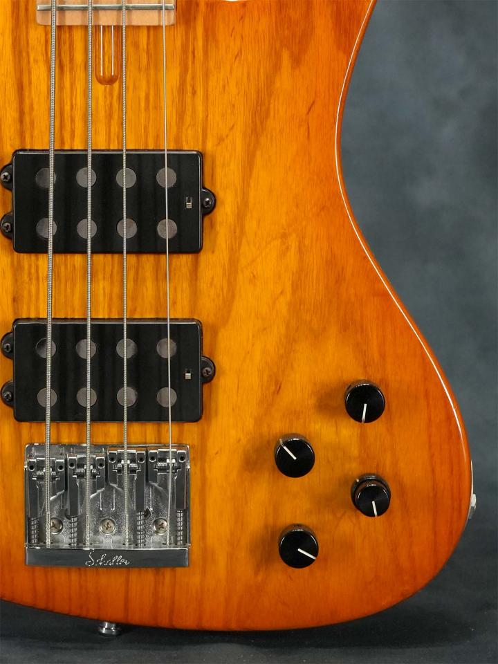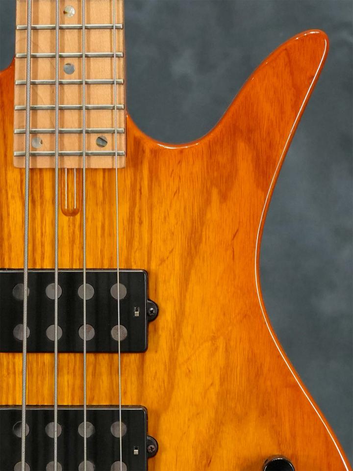 センター2-Pieceのアッシュボディ、864mmスケールかつナット幅38.1mmのメイプルネック、ツバ出し24F仕様のメイプル指板、ローラサドルを動かす事で弦間ピッチの調整が出来るSCHALLERブリッジ、SCHALLERペグ+4弦はヒップショットのドロップチューニングペグ、ピックアップはMusicmanスタイルのハムバッカーながら1弦側に付いた小さなスイッチでシングルコイルとハムバッカーを切り替え可能なカスタムピックアップ、Bartolini NTMB+Fプリアンプを内蔵しており、マスターヴォリューム・ピックアップバランサー・Treble/Middle/Bassの3-Bandイコライザーに加えてコントロールパネル内のトリムポットでゲインの調整も可能です。