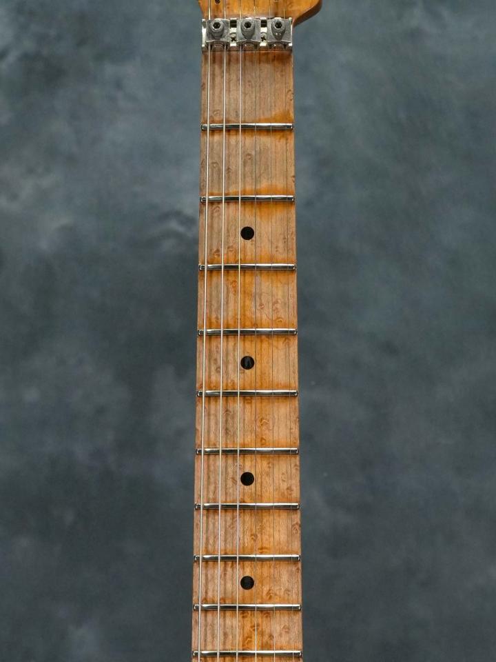 エイジド加工のため後から付いた傷との判別は難しいものの、違和感を感じるようなダメージは有りません。ネックはほぼストレートの丁度良い状態でトラスロッドの効きも良好、フレットは全く減っていない上で気になるようなビビりや音詰まりも無く、外観&演奏性共にコンディションは良好です。