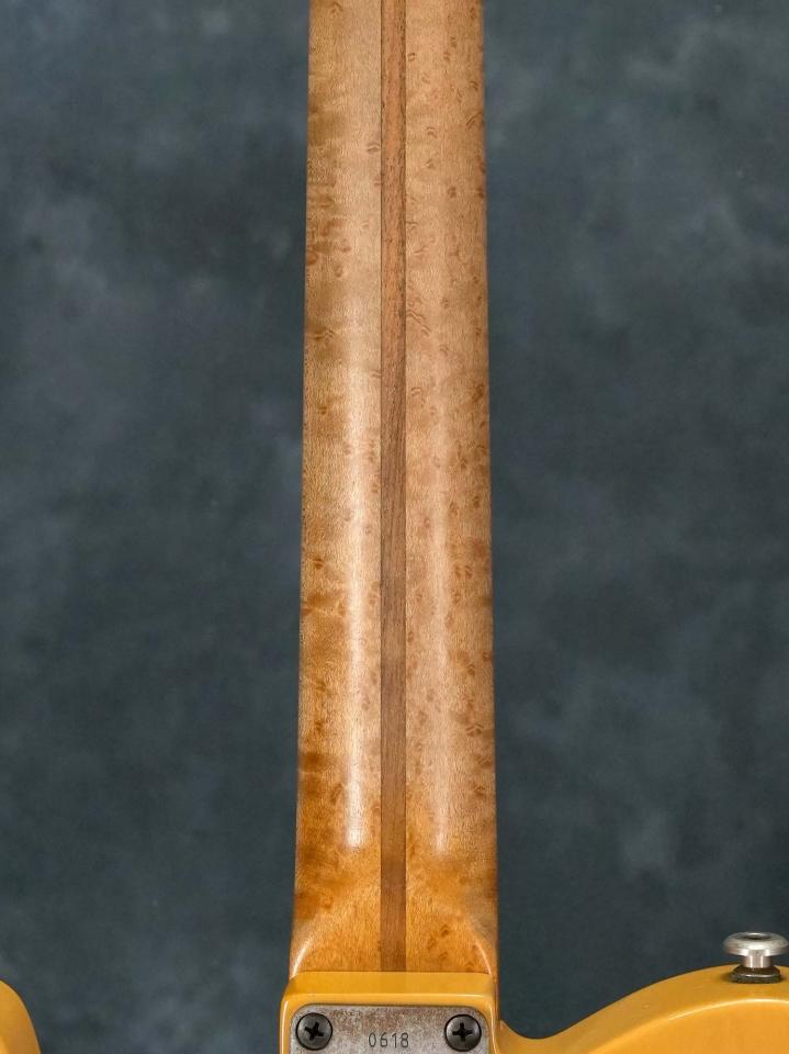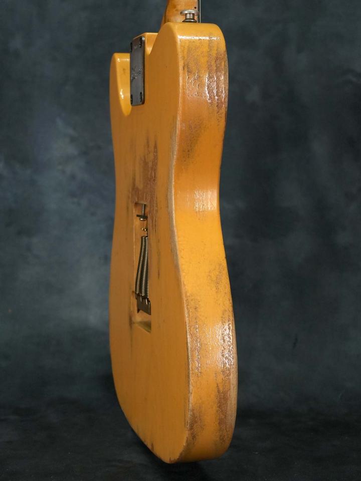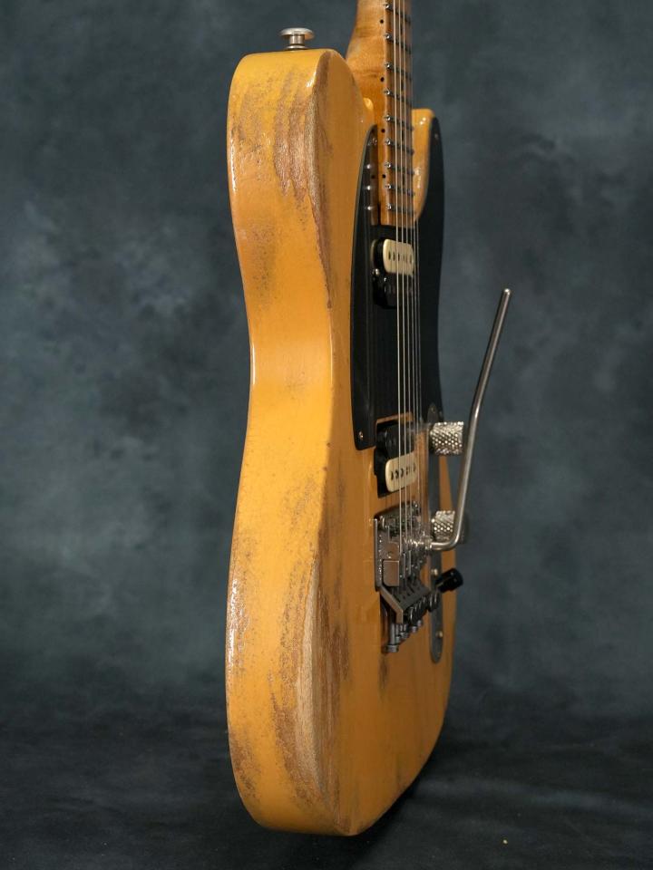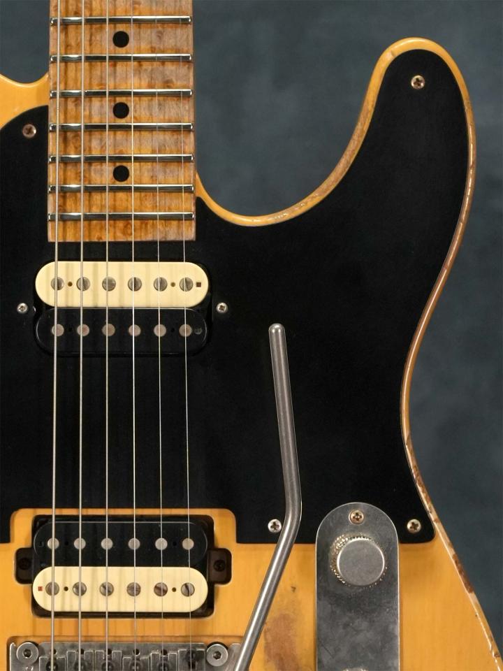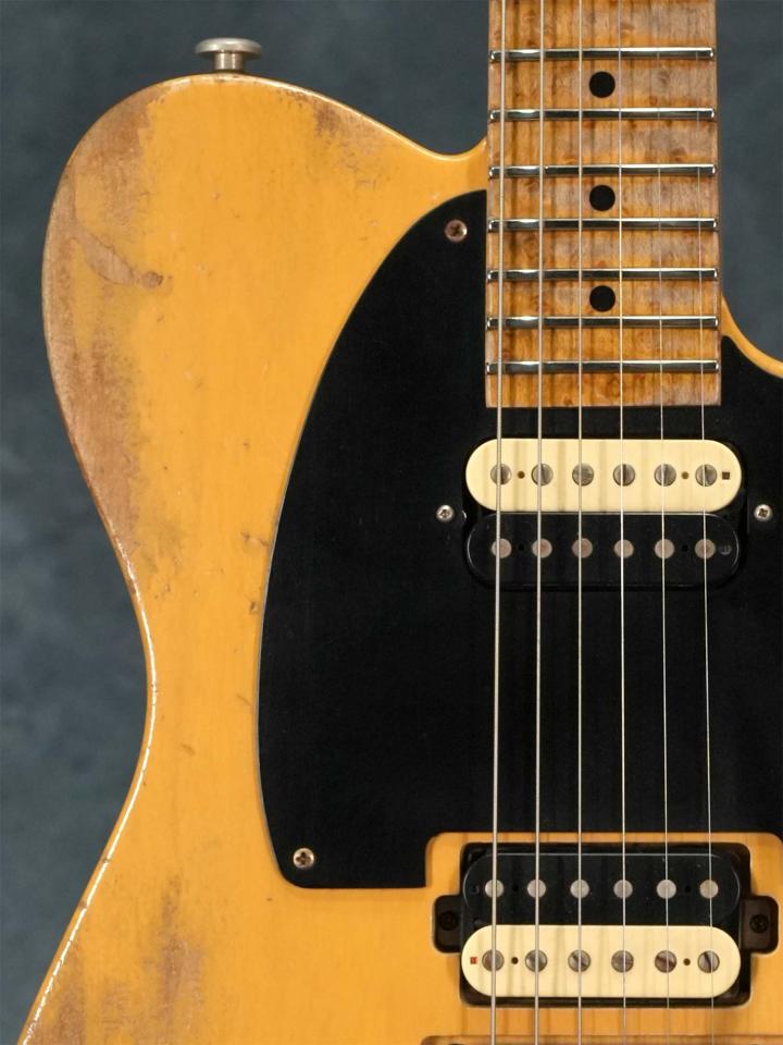 バタースコッチブロンド&ブラックガードにヘヴィエイジド仕上げながらクラシックなTLスタイルとは真逆とも言えるモダンなスペックで、Fender Telecasterの模倣ではなく他社とも異なった独特な雰囲気、クリーンでも歪ませても輪郭の潰れにくいアタック感の有る抜けの良い音色、ヴィンテージテレキャスターのような風合いながらダイナミックにアーミングも出来る2ハムバッカーのギターをお探しの方にオススメの一本です。