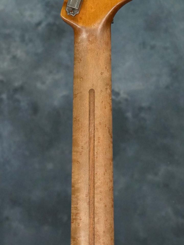 スワンプアッシュボディ、綺麗な杢目の出た1-Pieceバーズアイメイプルネックにリバースヘッド、10インチ~14インチのコンパウンドラジアス指板、ステンレスのジャンボフレット、リセス加工が施されたFloyd Roseロック式トレモロとロックナット、ピックアップはフロント&リア共にLuxxtoneオリジナルハムバッカー(直流抵抗はフロントが約7.7KΩ&リアが約13.8KΩ)を搭載し、長年に渡って激しく使い込まれてきたようなヘヴィなエイジド加工が施されています。
