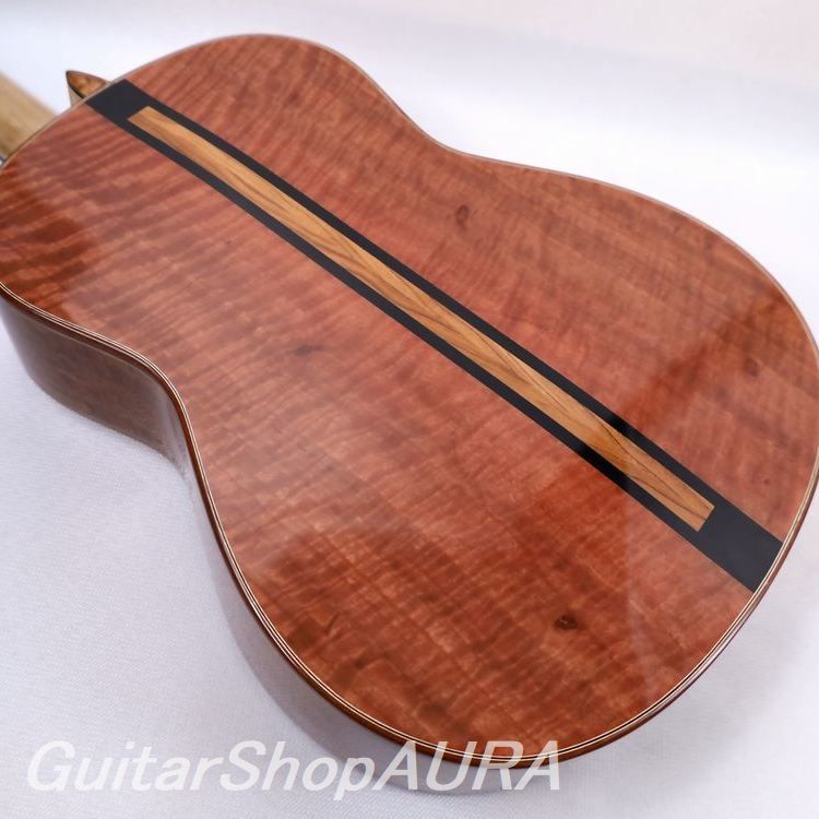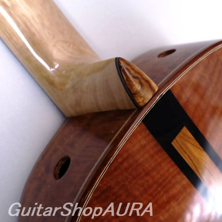 本作は2025年 シリアルNo.256 新作です。表面板はイングルマンスプルース、横裏板はオーストラリア固有産のジャラ材(Jarrah)を使用、表面板はマットな仕上がりのオイル フィニッシュで木材の質感が際立ち、対照的に独特の赤みと野趣あふれる木目が印象的なジャラ材の横裏板は深く艶を湛えたラッカーで仕上げられています。そのジャラの裏板センターの接ぎ部分と横板ボトム部の接ぎ部分には異なる木材(これもまた特徴的)による大胆なスクエアのインレイが施されており、表面板ロゼッタにも同じ材を使用したスクエアなデザインをあしらうことでグラフィックな統一感を演出しています。指板は表面板から少し浮き上がったようないわゆるレイズドフィンガーボード、裏板はアーチバックとなっておりこのカーブに沿うようにしてネックヒールもわずかに傾斜しているところは慎ましくも洒落た趣向となっています。さらに奏者の右ひじ部分にはおそらくはこれもジャラ材を使用したであろうアームレストが装着されています。これら全体が優美な曲線とリズミカルな立体感を生み出しておりこの点でもフォトジェニックな外観となっていることが特筆されます。