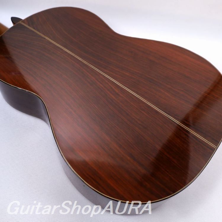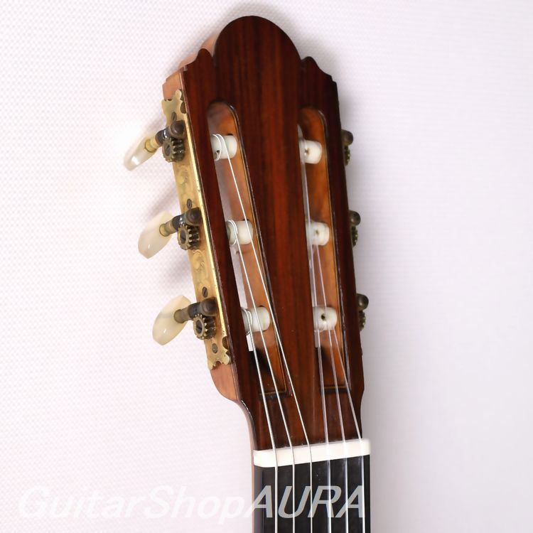 全体はセラック塗装、おそらくは塗り替え等はなくオリジナルの状態を保持していると思われます。表面板はこの時期のフレタにしばしば見られる現象ですが、ブリッジのサウンドホール側とボトム側とでやや歪みがあり、割れの修理履歴がいくつかございます。指板脇高音側に2箇所、駒板の高音側脇に20センチほどの長い割れ、駒板下低音側からボトムにかけて1か所それぞれ補修歴がありますがいずれも現状で継続使用への影響はありません。横裏板は経年相応の傷や擦れなどありますが外観を損ねるほどではなく、また割れもありません。ネック裏も経年相応の傷がありますが爪による過度の摩耗や通すの剥がれ等には至っておらず、演奏時の感触としては問題のないレベルです。演奏性に関する部分も問題なく、ネックは真っすぐを維持しており、フレットも適正値で特に目立った摩耗はありません。ネック形状はこの時期のフレタ1世の特徴的なほとんどCラウンドに近いDシェイプで、あまりコンパクトすぎずしっかりとしたグリップ感があります。弦高値は3.3/4.5mm(1弦/6弦 12フレット)でサドルに1.0~1.5mmの余剰があります。弦長660mmで弦高値もやや高めの設定ですが弦の張りはさほどに強くなく中庸といえるほどなので、さほどに演奏時のストレスは感じません。糸巻は製作時のままのフステーロ製を装着、機能的な問題はありません。重量は1.65㎏。