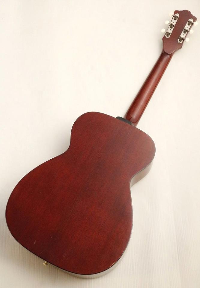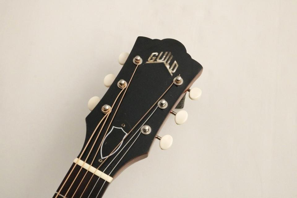 Guild の中でも特に小ぶりなモデル。しかしながら意外な程に大きな響きで鳴ってくれる一本。当時のギルドの人気の理由がワンストロークで理解できる素晴らしい一本です。抜けの良い高音と力強くピッキングすることで生まれる軽快なドライブ感のバランスはこの時代、このモデルでないと感じることが出来ない唯一無二の魅力を持っています。Guildギターの特徴の一つ大きなヘッドデザインとピックガードにロングサドルと独特なブリッジ形状、プレイヤーでないと気付きにくい点では指板が他ブランドと比較しても厚めでネックヒール付近のシェイプが肉厚、滑らかな仕上げになっています。細かな違いではありますがその仕様のどれもが無骨で繊細なサウンドの一助になっていると思われます。ナット幅は細めの約42mm幅に丸いネックシェイプ。握り込みのしやすいネック、ブレーシングはXブレーシングのノンスキャロップド、指板・ブリッジはローズウッド。この個体は1966年製個体、Guildらしさ全開の素晴らしいサウンドを持った個体です。