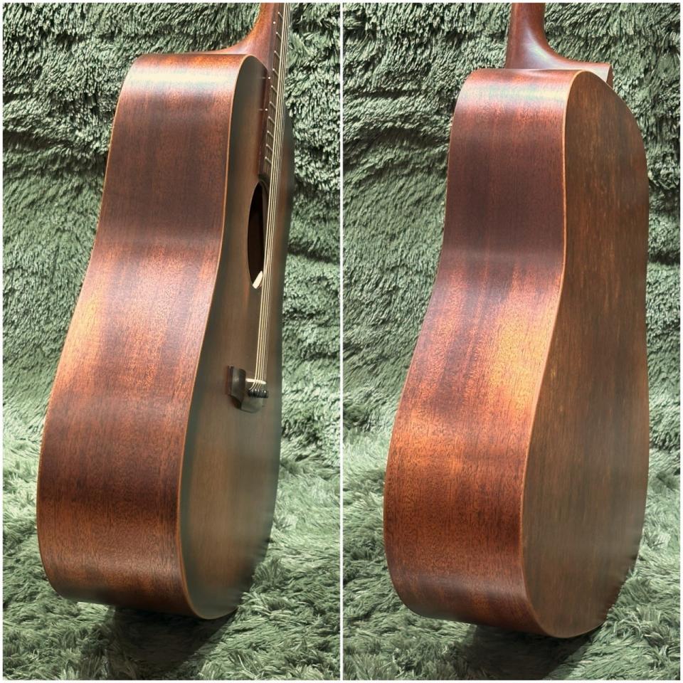 マホガニー・バーストと呼ばれるディストレスト・サテンフィニッシュによって、ストリートミュージシャンが使い込んできたギターのような風格を醸し出しているオシャレなギターです。