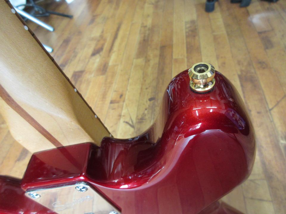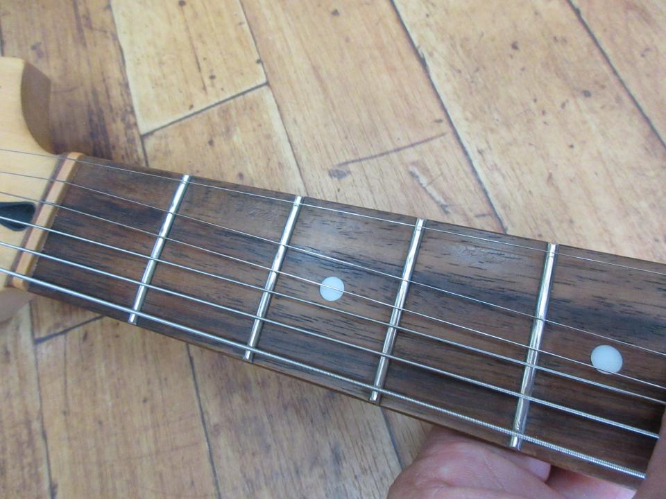 ピックガードが褪色なのか、黄色っぽいパールカラーとなっていますが、キャンディアップルレッドのBODYには傷、打痕ともほぼ無くきれいです。フレットは1,2,3弦の1~7Fに押弦によるくぼみが少し見られますが、プレイに支障はありません。付属のアームはオリジナルではありませんが、問題無く使用できています。ハードウェアに錆、くすみも無く、電気系も良好です。現在の弦高は6弦12F、約1,8mmに設定、オクターブ調整もしております。