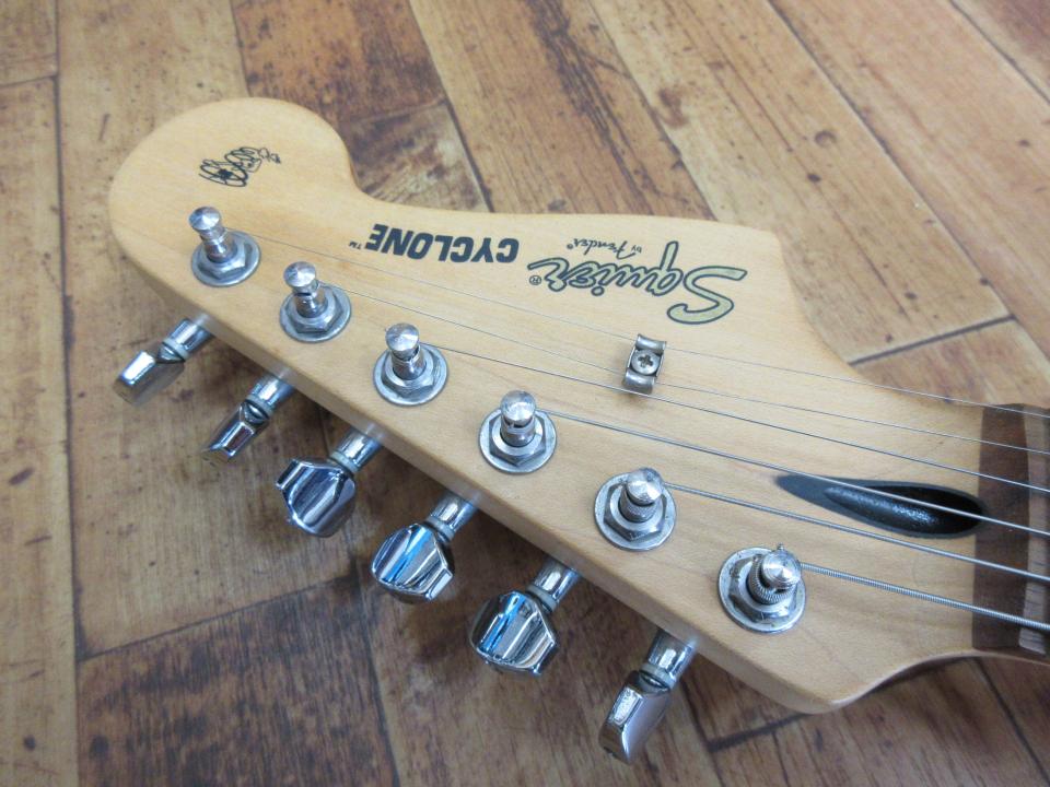 フェンダー・メキシコ・サイクロンをSQUIERで再現した2011年製SQUIER FSR CYCLONEです。取り回しの良いアルダーBODYにミディアムスケールのメイプルNECK,シンクロナイズドトレモロを搭載し、シングル(フロント)とハムバッキング(リア)のピックアップを3点切り替えのトグルスイッチ、1VOL、1TONEでコントロールするとても弾き易いギターです。