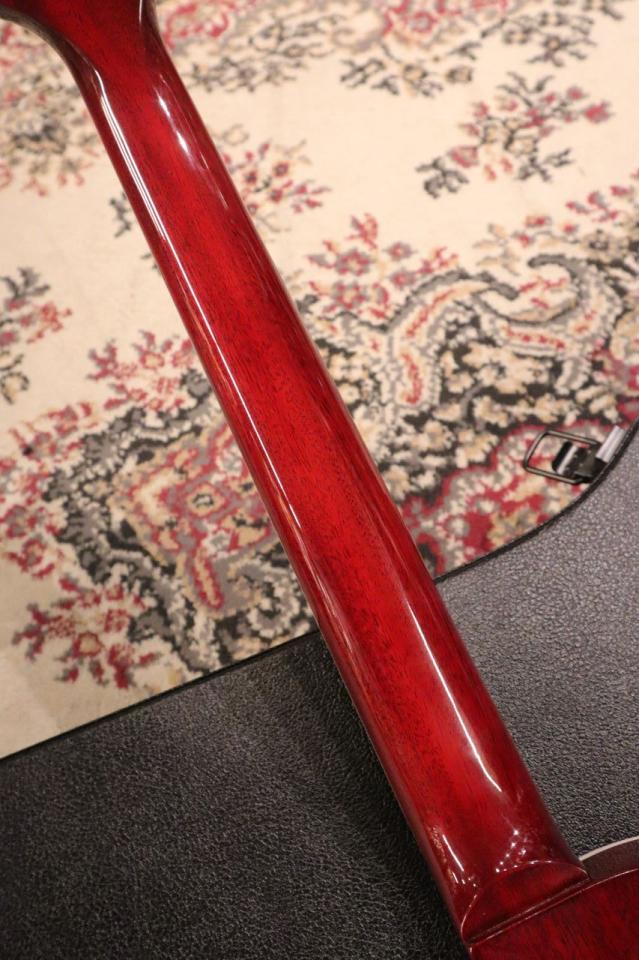 バックに目を移すとネックとボディのジョイント部分は大胆にカットされております。これはLes Paul Modelのウイークポイントであるハイポジションの演奏性を劇的に改善する加工です。また、もう一つのウイークポイントである重量もボディ内部をチャンバー加工することで解決。
