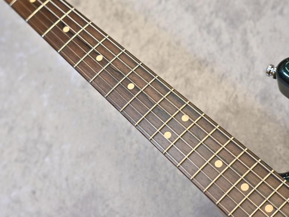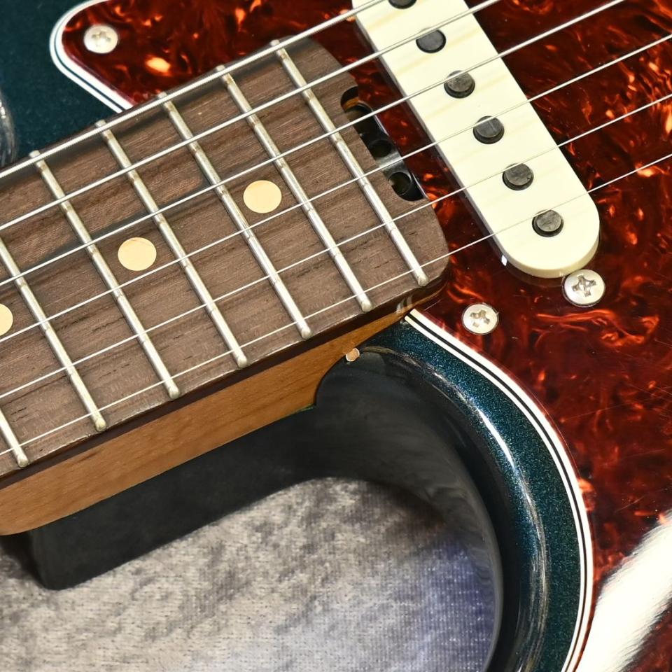 アルダーボディ、ローステッドメイプルネック(厚みのある太いネックシェイプ)、ホンデュラスローズウッド指板、240~305の円錐R、22F ホイールナット、右用のトレモロブリッジ(Freedom Custom Guitar SP-ST-01,Raw Vintage RVS-112)のカスタムオーダーならではの仕様。