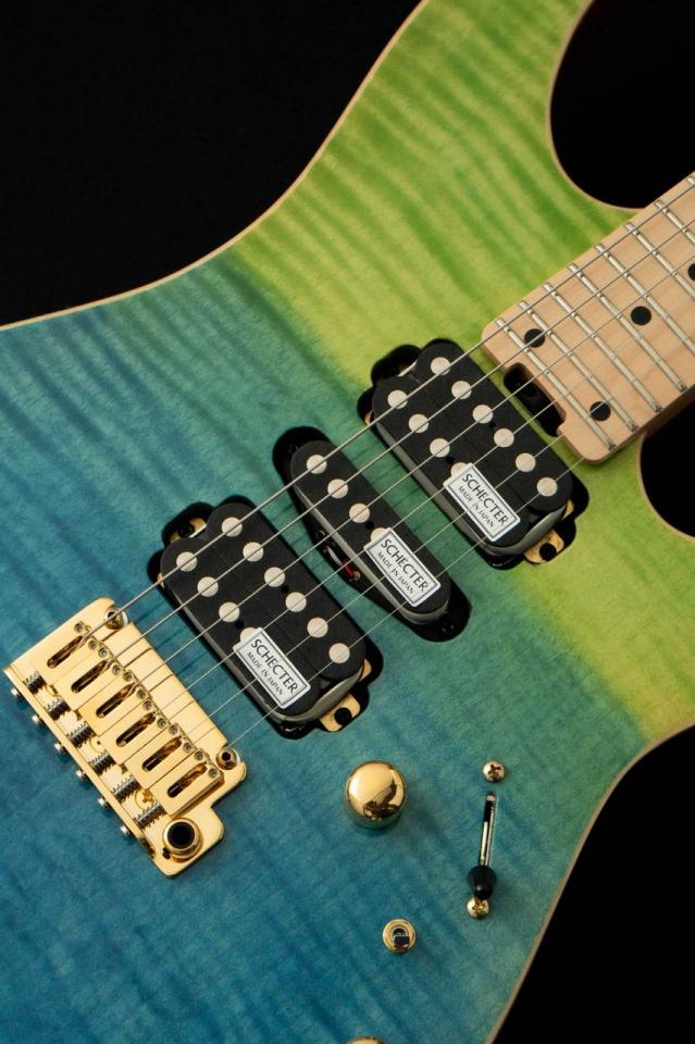 今回入荷したモデルは、SCHECTERの中で人気カラーであるDeep BlueからLight Greenに色が変化するフェードカラーで仕上げた限定生産モデル。