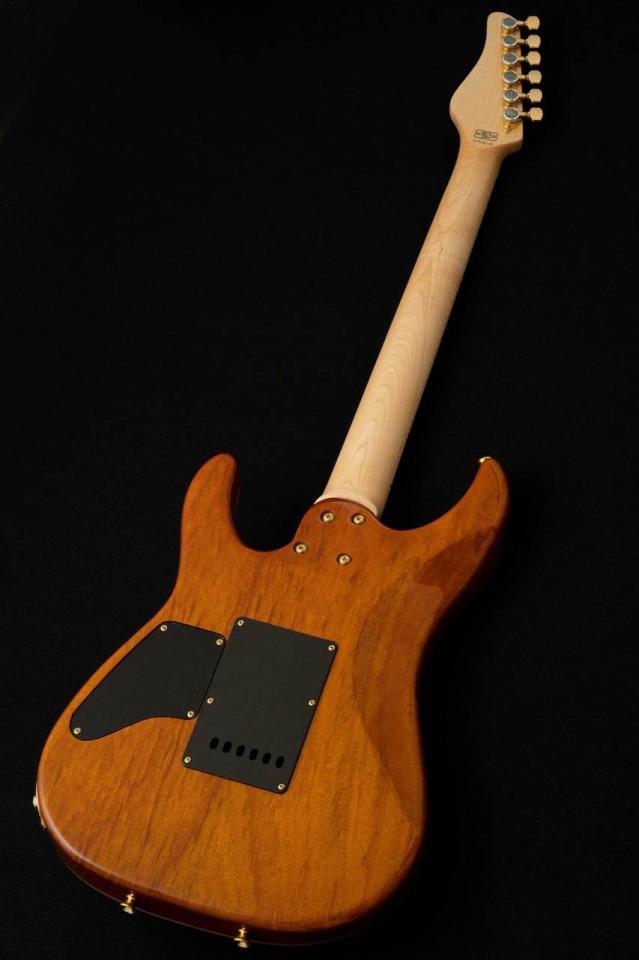 通常NVシリーズはフロイドローズが搭載されておりますが、シンクロブリッジ仕様に変更し弦交換も簡易かつ2点支持トレモロの為アーミングはロック式とまではいきませんが