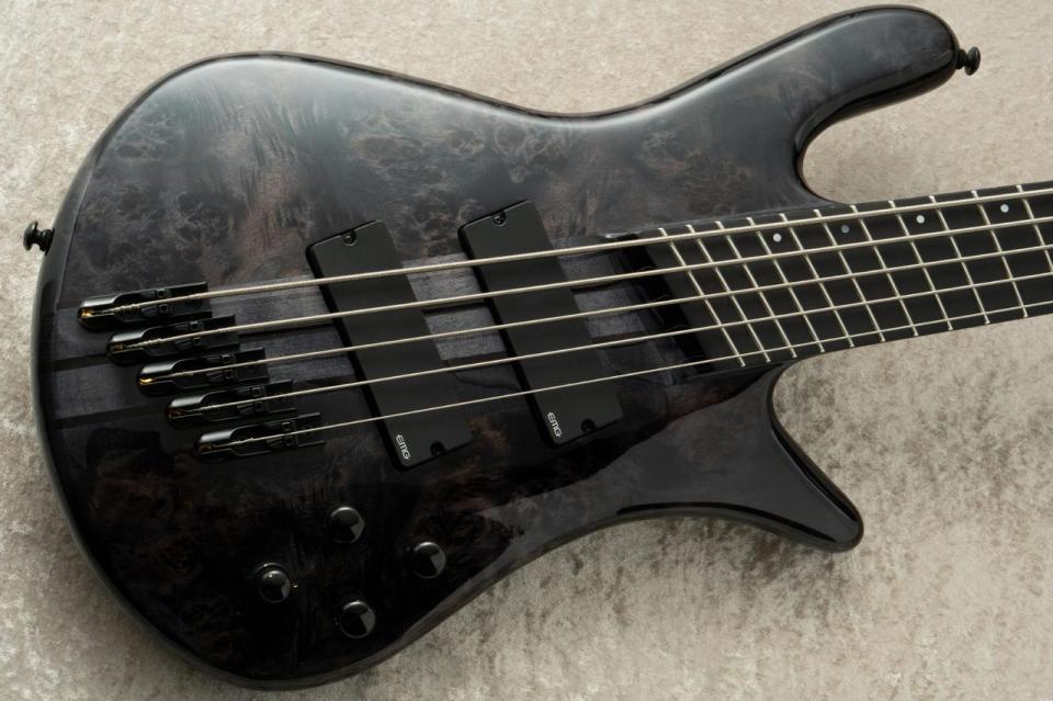 軽量なスワンプアッシュボディにポプラバールトップ、5プライのウエンジとメイプルのネック、エボニー指板のマテリアルに