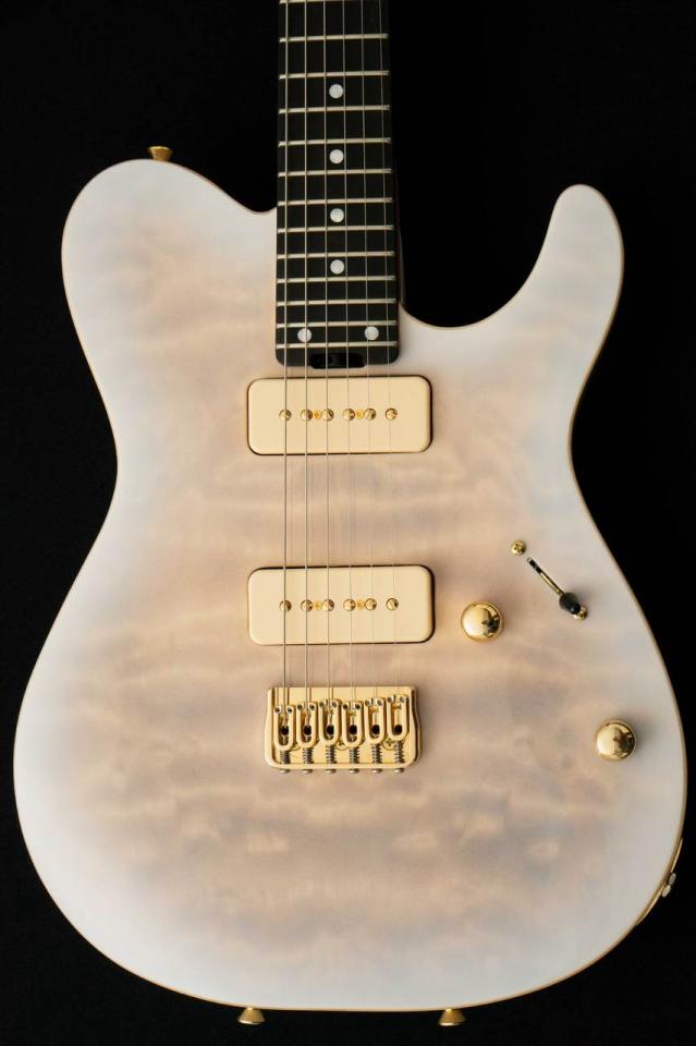 キルトメイプル杢目が透けて見えるシースルーカラーで、ボディ淵に向けて白が濃くなるバーストカラーとなっております。