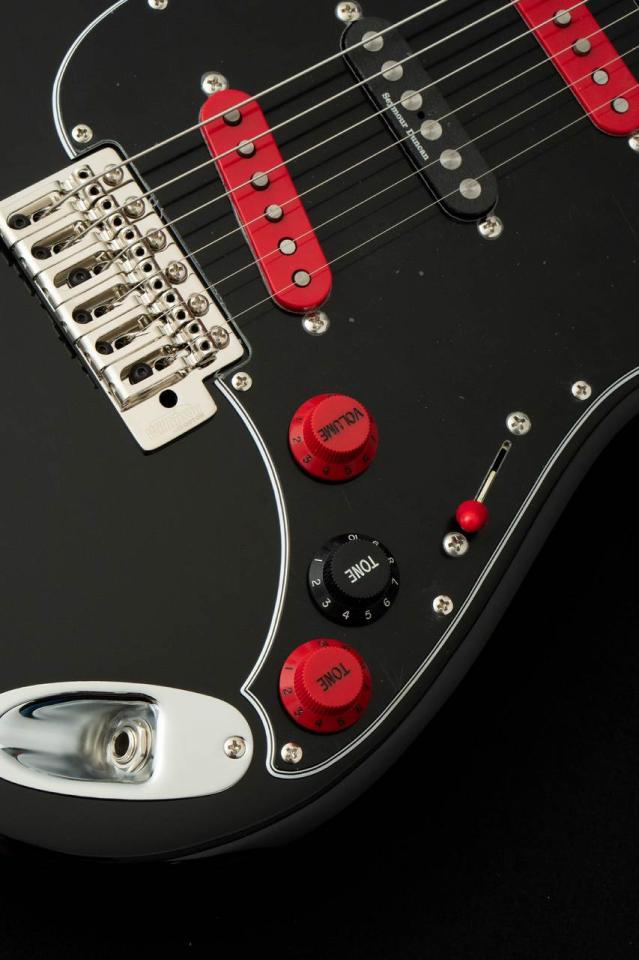 Controls : Pickup select 5-way switch (1: neck|2: neck & bridge pararel|3: middle|4: middle & bridge series|5: bridge)、Master volume(500k-A)、Tone(黒: 250K-A 473) Pickup select 5-way switchが〈1|2|3〉の位置にある場合用のトーン、Tone(赤: 500k-A 223)Pickup select 5-way switchが〈4|5〉の位置にある場合用のトーン