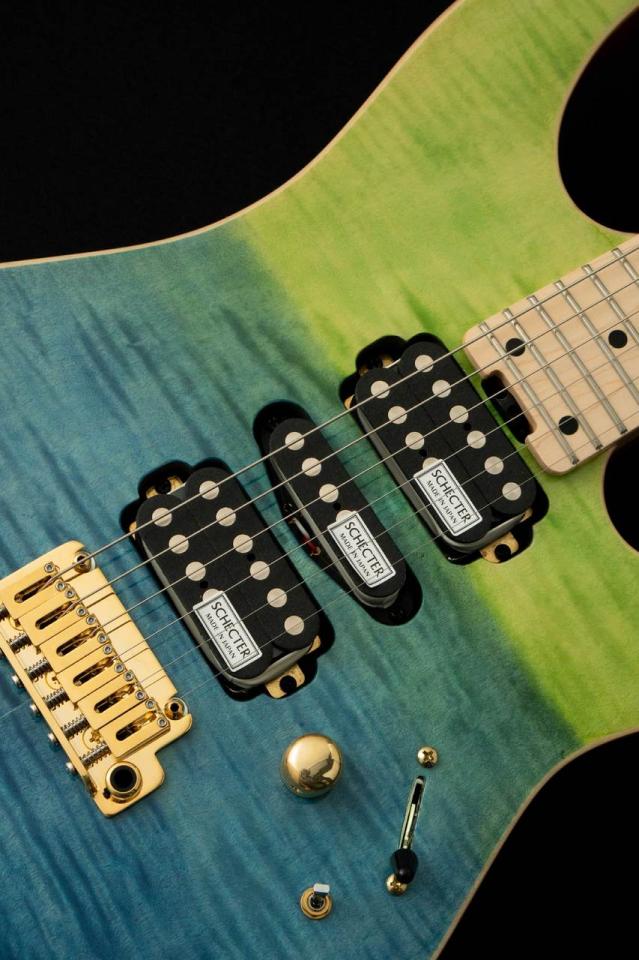 今回入荷したモデルは、SCHECTERの中で人気カラーであるDeep BlueからLight Greenに色が変化するフェードカラーで仕上げた限定生産モデル。