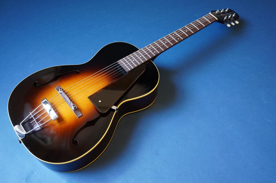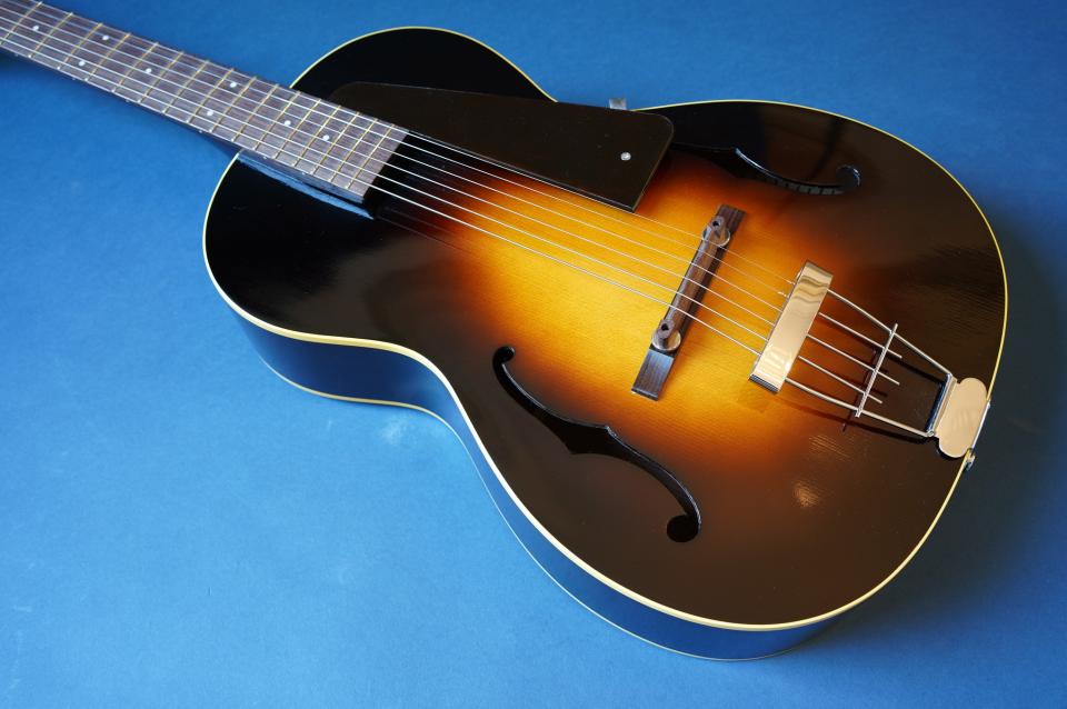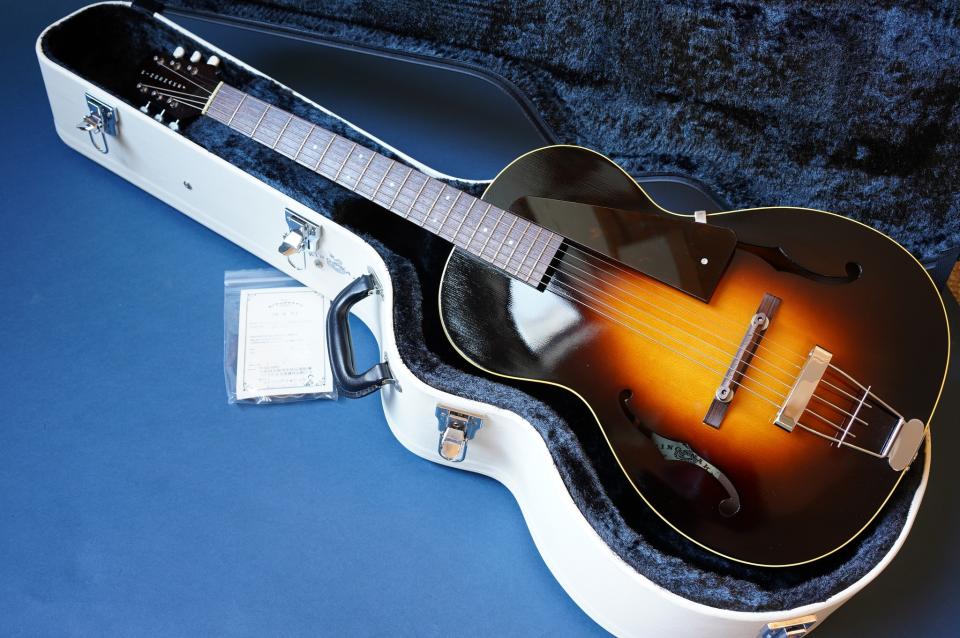 サイズ的にはシングルOタイプの超小型ボディをアーチトップ化。バックはフラットにし、極薄のラッカー塗装にすることで小ぶりながら豊な生音を生み出し、超軽量でホールドしやすい絶妙のサイズ感を持ったギターになっています。