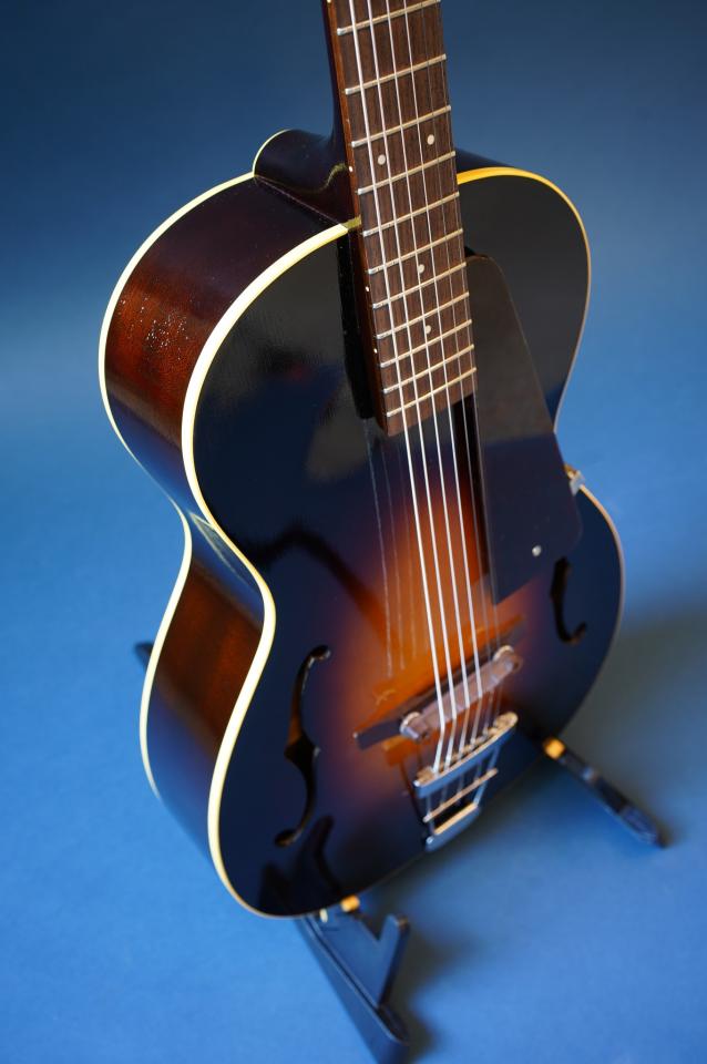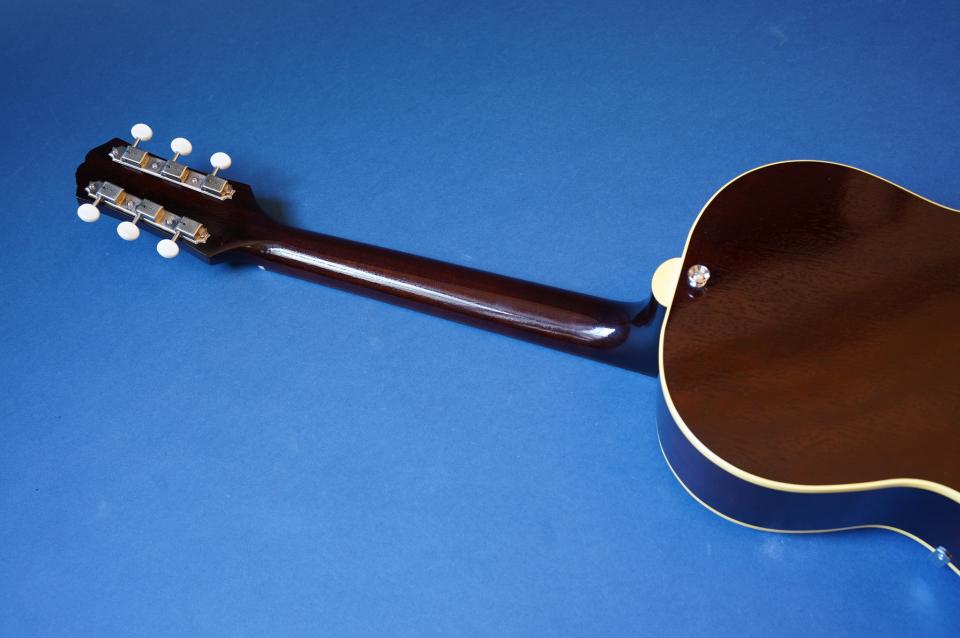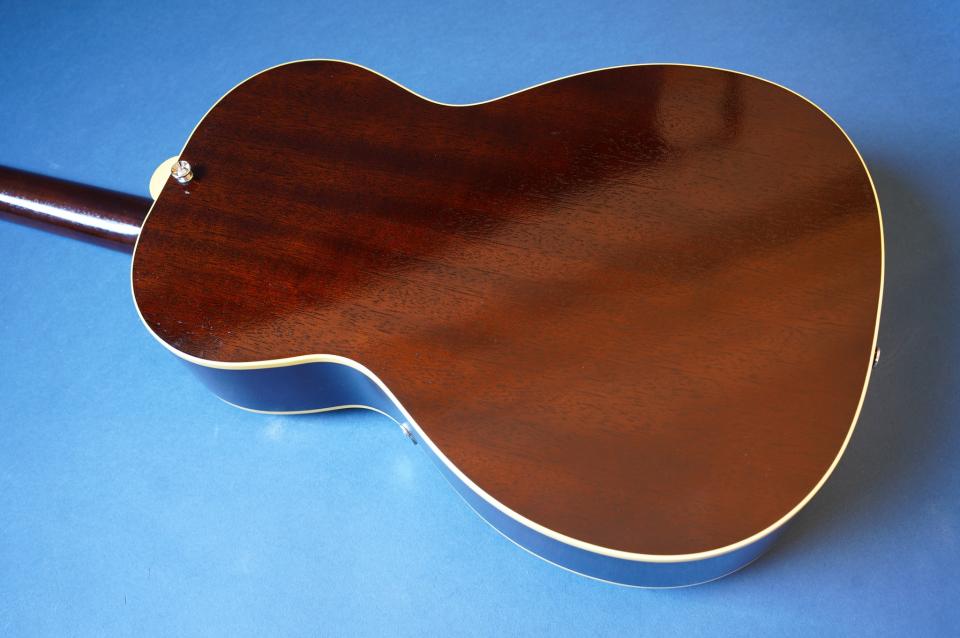 こちらはピックアップなしの完全アコースティック・バージョンな一本。戦前ギブソン同様にフラットバック仕様のおかげか、この小ぶりなボディの割に生音は豊かに鳴ります。指板エンド部には十分な隙間があるため、お好みのピックアップと組み合わせてエレキ化するのもいいかも。