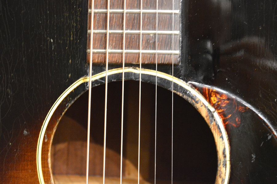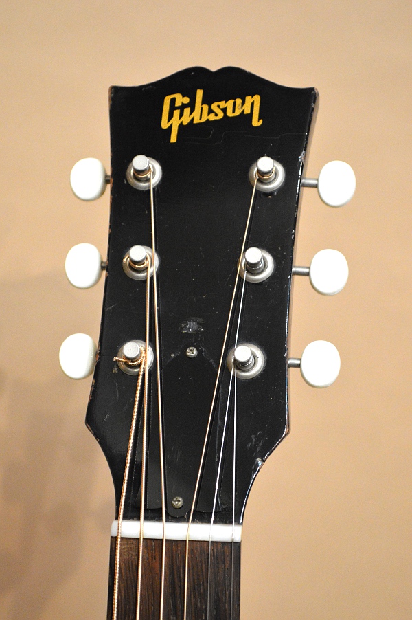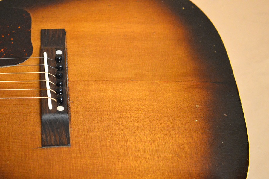 楽器のコンディションは、年式なりのキズや使用感、経年感があり、やや大掛かりな修理がされた形跡があります。過去にネックが前に倒れてきたようで指板脇にクラックが入り修理されています。現在はネックの仕込み角もばっちり治っていますが、指板脇のクラック修理に伴いサウンドホール・リングの上部に少し歪みが出ています。恐らくネック・ブロックごと動いたのか?トップの指板脇やバックのネック・ブロックから1番目のブレーシングの間には大きめの割れ止めが打たれています。また、あまりネックの強度とは関係ないようにも思いますが、、ヒールに打たれているストラップピンのネジは長いネジが使われていて、ネック・ブロックを貫通し、内側でボルトで固定されています。その他にはこの年式のギブソンに付きもののPGの変形に因るPG脇のクラック修理があり、こちらもかなり大きめの補強が打たれています。この年代のLGはPGの変形でトップに歪みが出ているモノも少なくないので、恐らくトップの変形を修正する目的で大きめの補強が打たれているものと思われます。また、トップのブリッジ下の膨らみを押さえる目的で、ブリッジ下のブレーシングとブリッジ・プレートの間にブリッジと同じ長さ位の補強のブレースが足されています。そのおかげもあり、現状トップは大きな波打ちは無く、かなり良い状態に修復されています。トップのブリッジ下、センター・シーム部も一度剥がれ接着修理されています。その他は年式なりのキズやちょっとした塗装剥がれなどあり、年式なりのヤレが感じられますが、弾く為の楽器としてはしっかり修理調整されていますので、今後長くお使い頂くにも不安は無いでしょう。