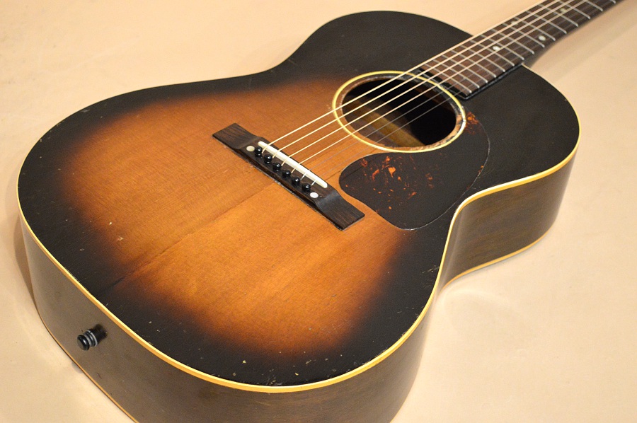 LG-2の廉価モデルとして1943年から生産がスタートしたLG-1。LG-2や3とは違うラダー・ブレーシング構造を持つLG-1は、カラコロとした独特なサウンドで人気を集め、今なおこのLG-1サウンドこそがイイ!というファンも多い、ギブソン・フラットトップの隠れた人気モデルです。今回入荷は54年頃の1本。年々入手が困難になってきている50年代LG-1ですが、中でもスモール・ガードの55年以前の個体は、本場アメリカでも非常に高価で、なかなか手に入れることが難しい稀少なアイテムとなってきています!