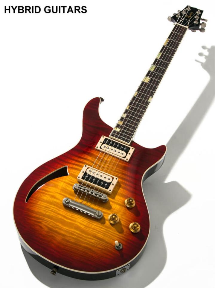 本機はGibson Les Paulに近いダブルカットのボディにES-335等に代表されるセミホロウ構造を採用しています。あくまでも基本となるのはソリッドサウンドで、そこに+αとなる空気感やより立体的なサウンドを可能にした印象です。ボディトップに美しいFlame Maple、ボディバック・ネックにMahogany、指板にRosewoodを使用しており、Gibson Les Paulと同様のウッドマテリアルを採用しています。フレットにはミディアムジャンボサイズのフレットを使用しています。