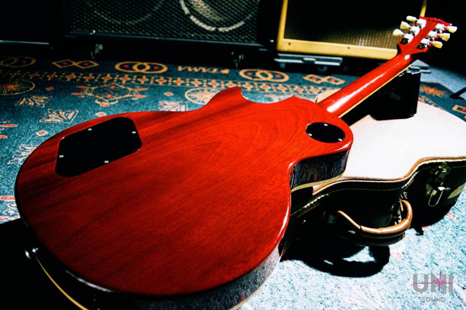 トップにはプレーンメイプルを使い、ボディはウエイトリリーフなしのソリッドマホガニーです。