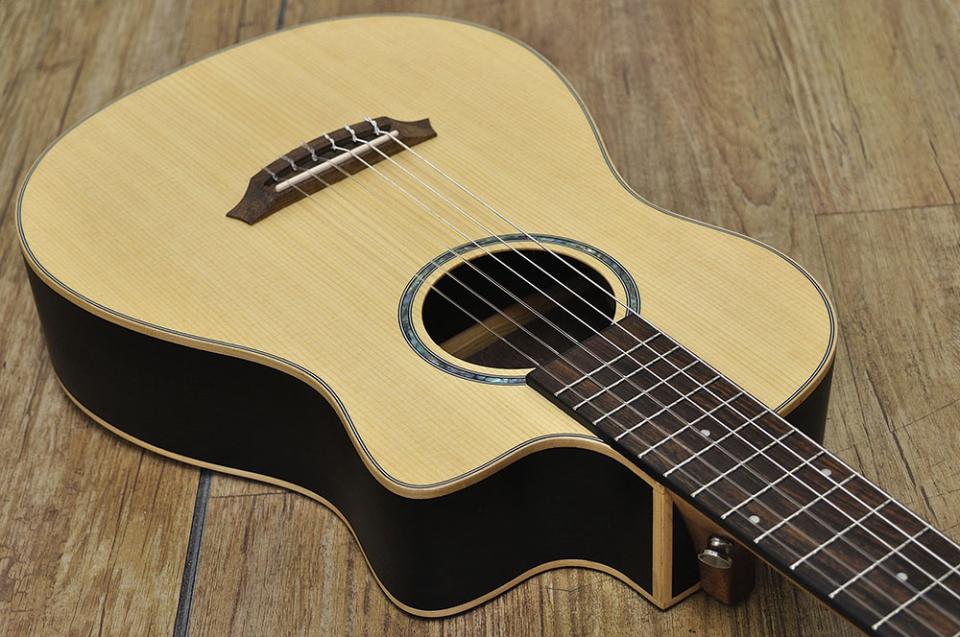 明瞭でコシのある中低域が魅力で、コンパクトなサイズながらもふくよかな鳴りを感じさせます。トップにはスプルース単板を採用し、粒立ちの良いアタック感と抜けの良さを両立。