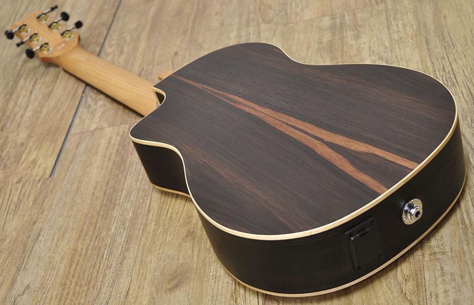 ボディはエキゾチックなエボニー材をバック&サイドに使用。