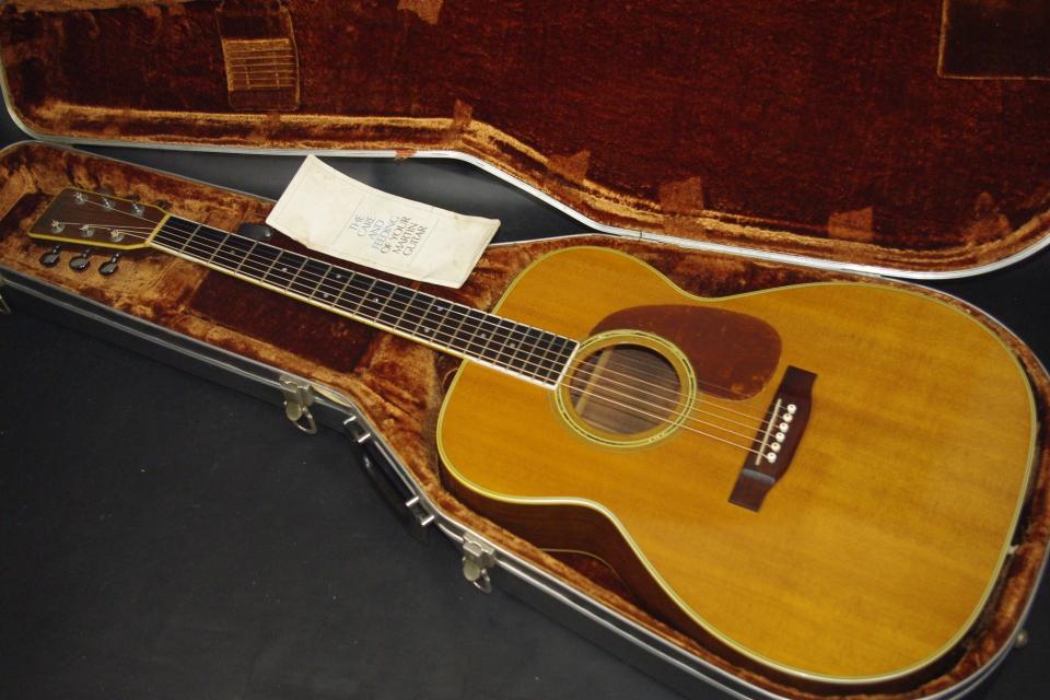 1977年から生産開始されたマーティン M-38が入荷しました!!トップはシトカスプルース、サイドバックにはインディアンローズウッド、指板はエボニーですがブリッジにはローズウッドを採用しています。トリプルオーより一回り大きいボディに約645mmのロングスケールなのが大きな特徴です。ドレッドノートと比べると薄くとても抱えやすい形状ですね!シリアルナンバーから1978年に生産された個体になります。シャーラー製のペグ、雰囲気の良いべっ甲柄ピックガード、ブリッジもオリジナルで残っていました。ネックヒールへのストラップピン加工、ピックアップの取り付け加工はございません。小傷、ウェザーチェックは出ていますが全体的に綺麗でオールドらしい雰囲気が堪りません。ナット幅は約42mmの太すぎない握りやすいグリップになります。ネックのアングルは僅かな順反りはありますが許容範囲です。フレットは交換済みで長期で安心です。サドル残は少なめですが弦高は12フレット6弦側で約2.6mm、1弦側で約1.9mmの高さで押さえやすく調整しています。煌びやかな高音が魅力でフィンガーピッキングでは美しく広がります!!スキャロップドXブレーシングを採用していますのでハリ、ヴォリューム感がありストロークもパワフル!滅多に出てこない70年代モデル!探していた方は是非この機会にお試しください。オリジナルハードケース付。