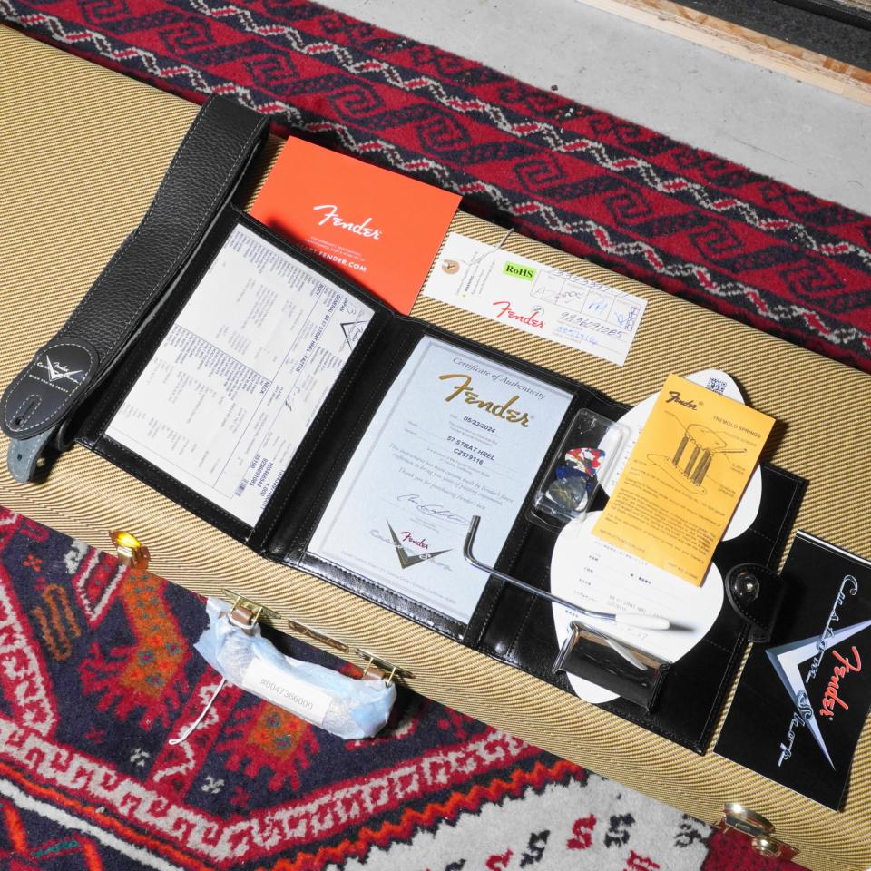2024年製。非常に軽量な2ピースセレクトアッシュボディに、57年スタイルのSoft "V"シェイプを採用した1ピースリフトソーンメイプルネック、1-plyパーチメントピックガードを備え、50年代後期のストラトキャスターの仕様を再現した1本です。ピックアップにはCustom Shop製 Hand-Wound Tomatillo Stratocasterピックアップを3基搭載、ナロートール(6105)フレットを採用した9.5インチラジアス指板を採用しております。