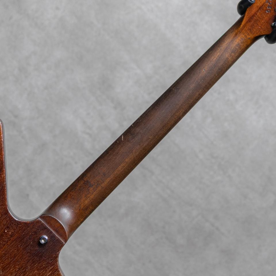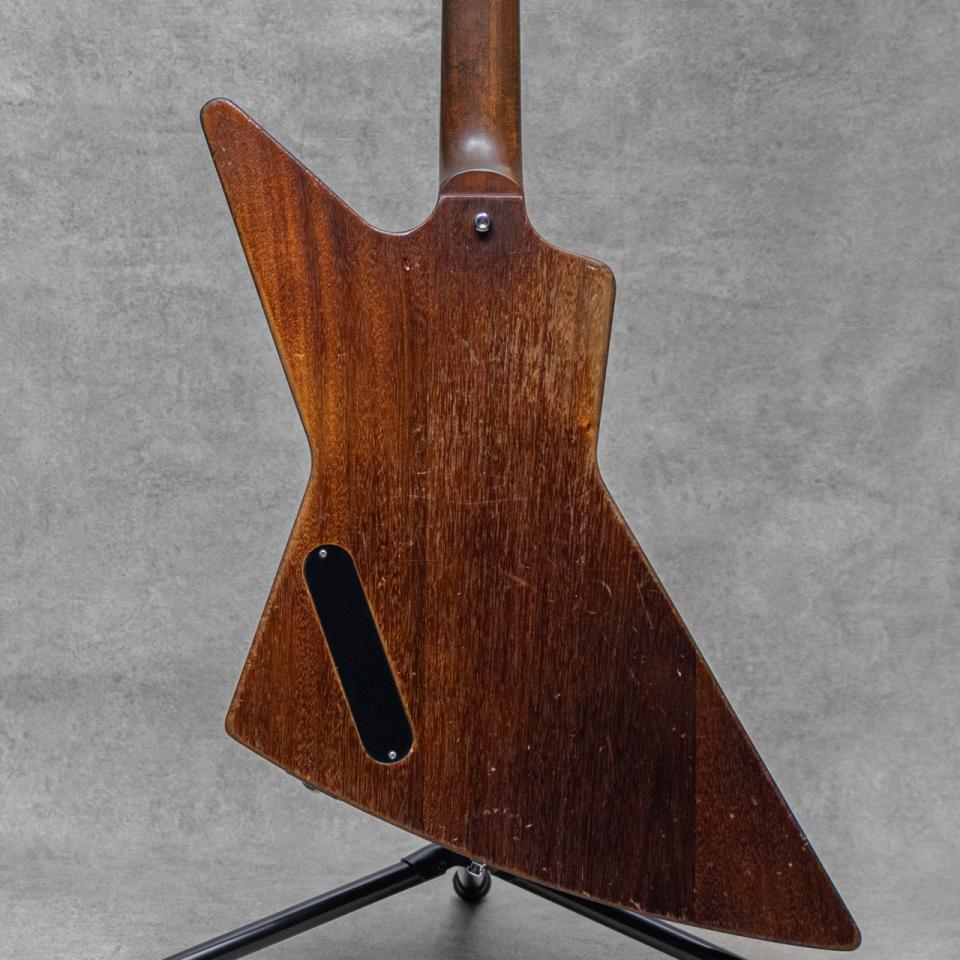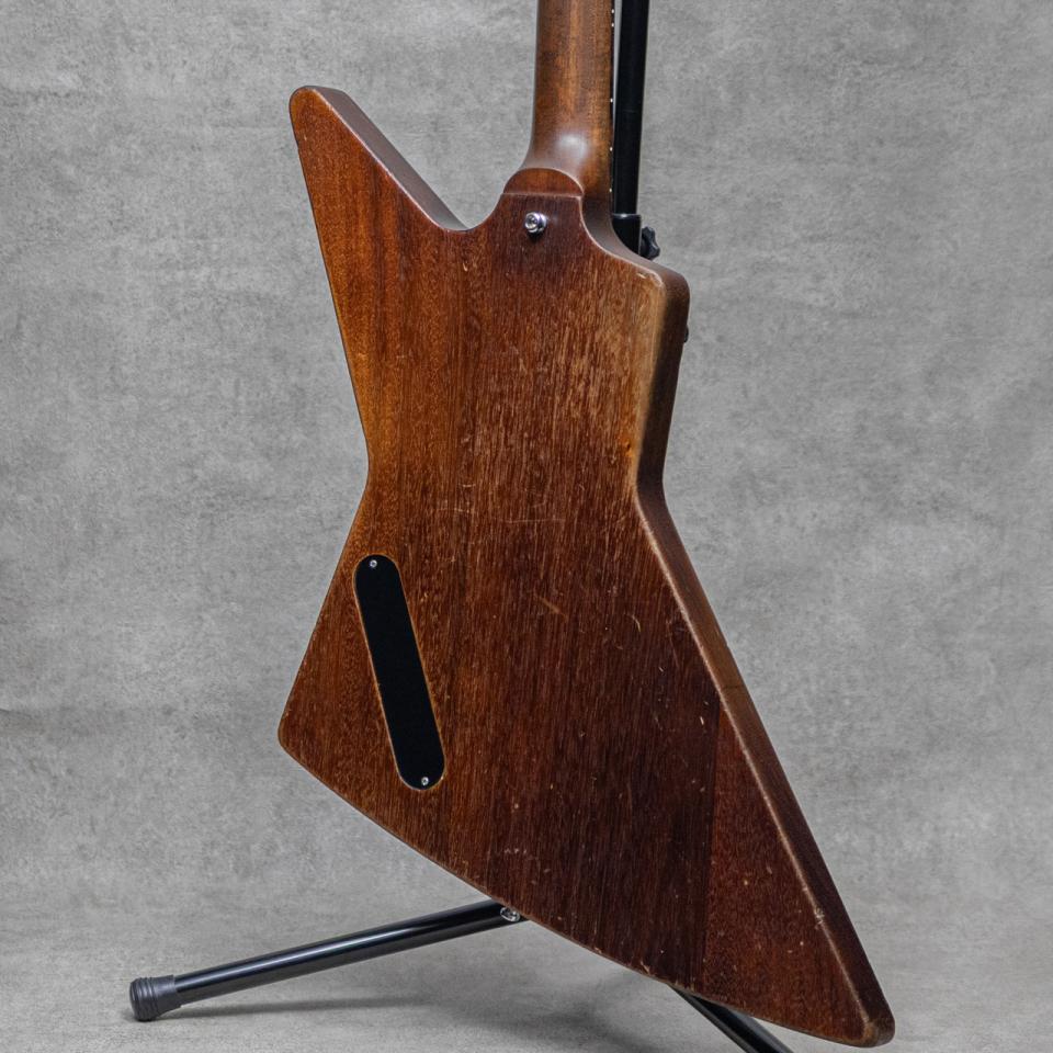 ブックマークする 値下げ通知に登録1958年登場のギブソン"Explorer"は"Flying V"とともに元祖変形ギターとして知られるデザイナーモデル。その前衛的なデザインから当初はあまり市場開拓に建設的な扱いではありませんでしたが、エリック・クラプトン、アレン・コリンズ他、名だたるプレイヤーの影響もあり急速に浸透、その後ロック~ヘヴィメタル~とより攻撃的なサウンドが求められるシーンにおいては、ジェイムズ・ヘッドフィールドを始めとする多くのビッグネームの貢献により、ロックギターの象徴的なアイコンとしての地位を確立しました。本器は2008年製"Explorer Feded"、Worn Brownカラー。全体の塗装フィニッシュを艶を消したマットな仕上げで価格を抑えた"Faded"のラインナップは、木の導管が感じられるナチュラルな手触りと、薄い塗膜によるオープンな鳴りが魅力。ピックアップには高出力セラミックマグネット採用の496R&500Tを搭載。ハイパワーで切れの良いアウトプットは、ともすれば"ドンシャリ"気味に聞こえてしまうことも多々ですが、本器では特徴的なミドルの厚みがある"Explorer"のサウンドキャラクターとも絶妙にマッチして、意外なレンジの広さを持った扱いやすいクリアなサウンドをお楽しみいただけます。こちら全体的に雰囲気抜群のウェアが見られますが、構造上の問題になるダメージは一切なく、ロッドの調整を含め大変良好なネックコンディションで弾きやすいローアクションのセッティングができております。ピックアップは本来オープンタイプが採用されていたモデルですが、クロームのピックアップカバーが追加されている他、ストラップピンもシャーラーのロックタイプに交換されております。がっつり弾き倒して頂きたい1本。ぜひご検討ください。オリジナルハードケースが付属。