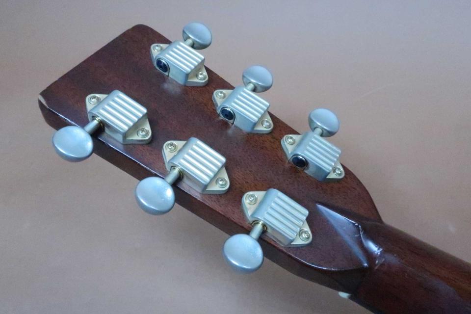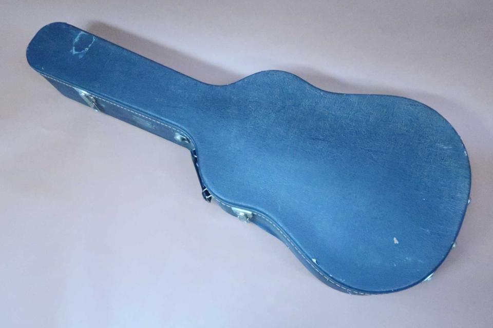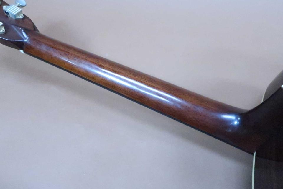 状態は年代から考えれば使用感も少なく、ペグのメッキの曇りなどは見受けられますが機能的にも問題はありません。ヘッド裏の右上部に角に打コンとサイドに弦を巻いた時のワインダーの跡が薄く有るぐらいで、トップは光に翳してわかるぐらいの極軽微な打コンがボディエンド付近に僅かに有るぐらいで、サイドも軽い塗装上の擦り傷ぐらいでバックも目立つ酷いダメージも見受けられず年代から考えても美品コンディションを保っております。ネック裏も気になるダメージも無く、フレットも9分目程度は残っており演奏性も問題はありません。ネックヒールんのピン打ちはありません。エンドピンは12mm用のエボニーピンに交換されていますので、ピックアップの取付は加工無しで可能です。。弦長約646mm、ナット幅約43mm、弦高は12F6弦約2.2mm、1弦約1.5mm、サドルの余裕は約2mmあり、ネックの反りや元起、ブリッジ下の膨らみなども問題が無くネックを含めプレイヤビリティも良好です。当時のヘッドウェイ・オリジナル・ハードケースも付属していますが、バックエンドの外張りの補修がありますが留金などの破損は無く内部は綺麗で持ち運びや保管には問題ありません。中古市場でも玉数の少ない初期モデルを、是非この機会に試奏やご購入をご検討を頂ければ幸いです。