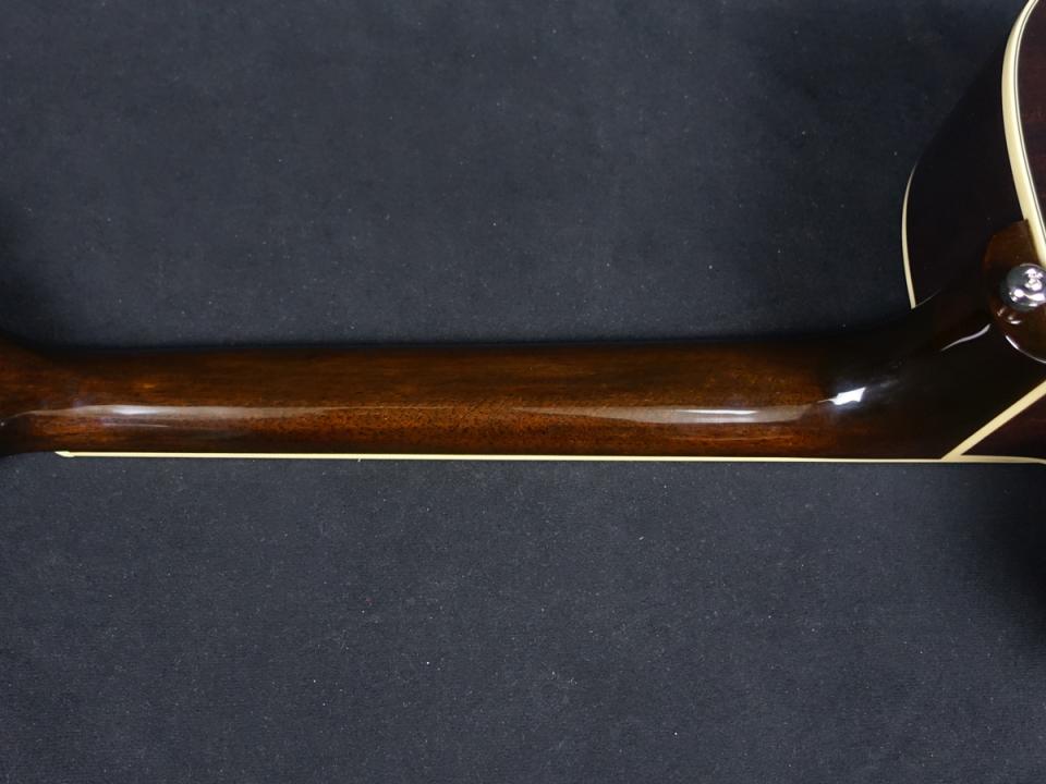 マホガニーネックは快適なプレイヤビリティを約束するラウンド C プロファイルで、もちろんダブテイルジョイントでボディに接合されています。