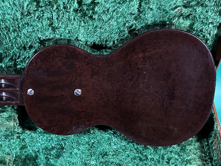 ベークライトボディー、オリジナルピックアップはMODEL-B同様ですが、ゴールドクルーソンペグ、濃い茶色のボディー、ゴールドカバープレイト、ヘッドカバーがセットされています。