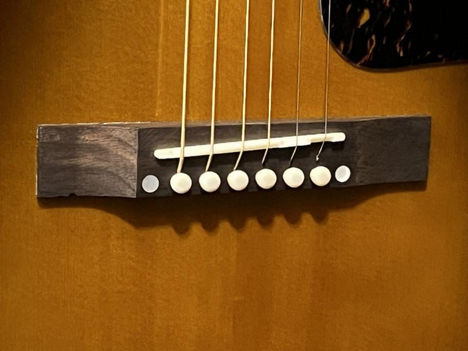 その他、ミディアム・フレットによる19フレット仕様のローズウッド指板には、マザー・オブ・パールのドット・ポジションマーク・インレイがあしらわれ、ローズウッドのレクタングギュラー・ブリッジ上のサドル、ナットとブリッジ・ピンには、それぞれボーン材を使用しています。