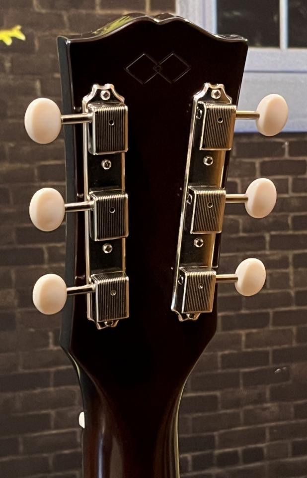 エピフォンの“スクリプト&バナー”ロゴがあしらわれた“オープンブック・ヘッドストック”と呼ばれるギブソンと同じヘッド形状があげられます。また、ヘッドに搭載されているチューナーも、ギブソンと同じクリームボタン・タイプを採用し、一見するとギブソンと見分けがつかないほどの再現性を持ちます。