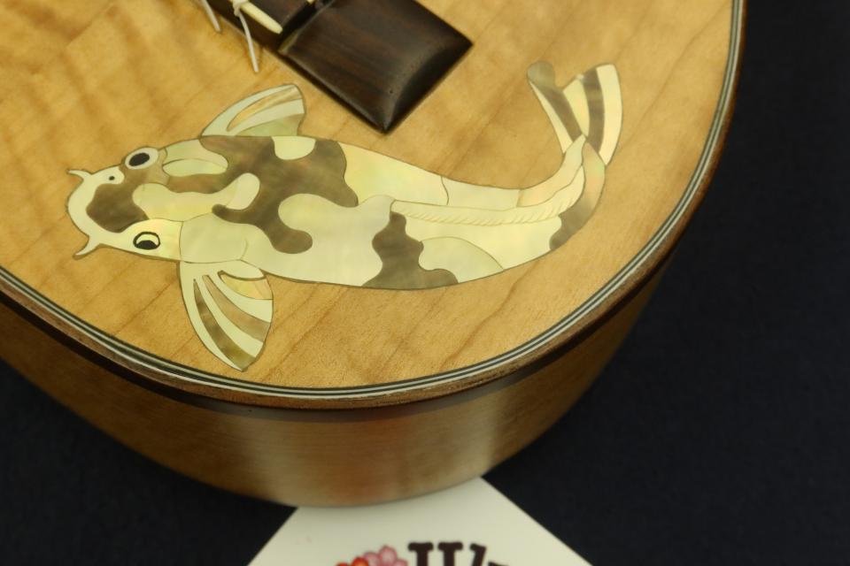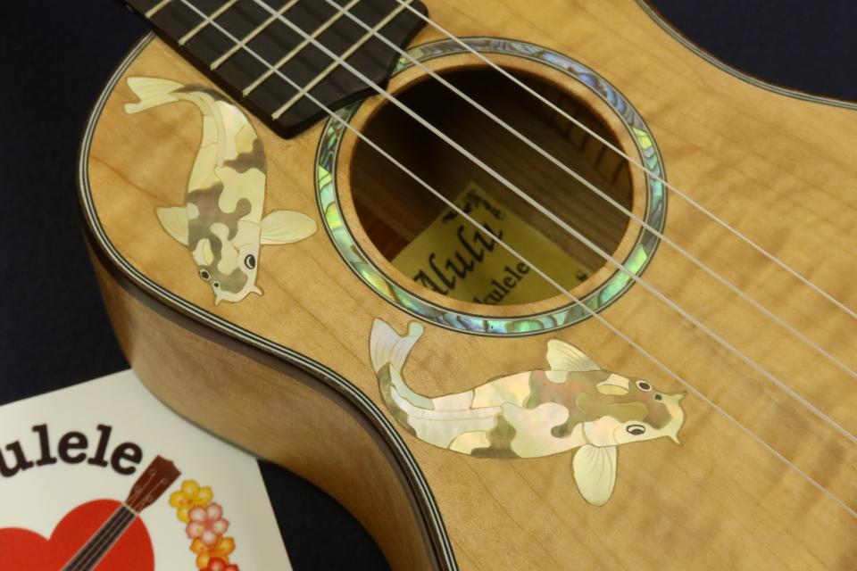 閉店SALE30%OFF! ウクレレ*アート!美しいシェルのインレイ。3匹の鯉のシェル・インレイがおしゃれ。綺麗な木目の単板カーリー•メープルのボディ。