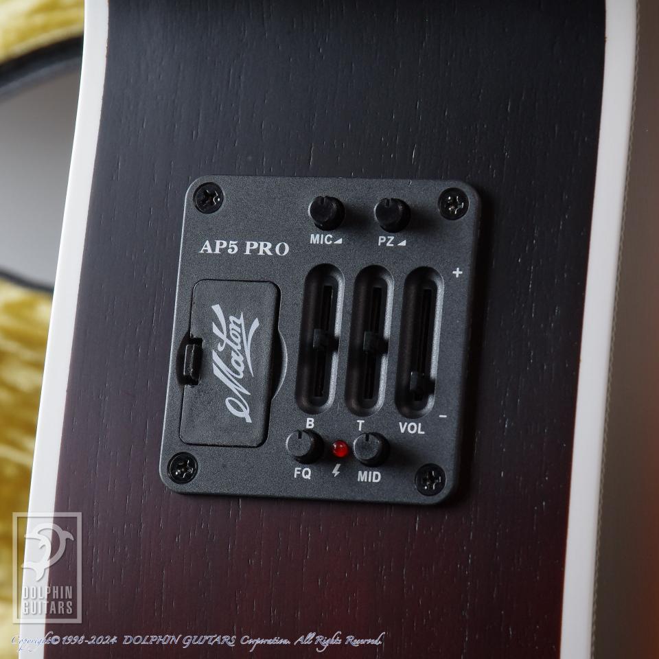 搭載されたAP5pro PUシステムは、オリジナルのアンダーサドルPUにコンデンサーマイクを併用する事により、奥行きのある音域と抜群なエアー感に加え、ボディーヒット音も余すことなくアウトプットします。また、高い出力を持つプリアンプを内蔵しておりますので、外部プリアンプ等を使用せずとも、そのままプラグインしていただければ極上のサウンドをお楽しみいただけます。PUとマイクVolは完全に独立しており、手元での出力バランス調整が可能ですのでお好みや現場に合わせてご使用下さい。