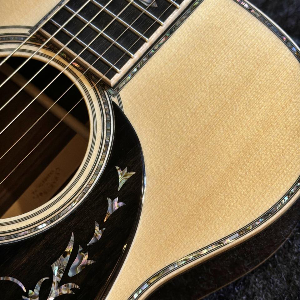 華やかなエボニー・フローラルインレイ・ピックガード、バインディングやロゼッタ等の細部に至るまで、可能な限り自然素材を使用したことで人工素材では表現できない質感と温もりが際立つ一本!