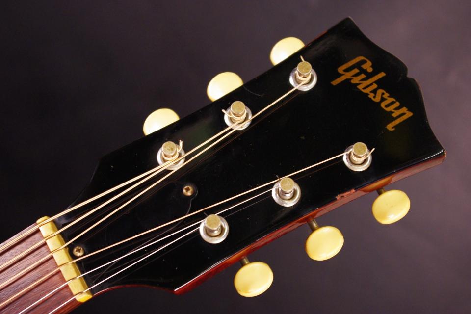 1960年代!人気J-45が味わい深いチェリーサンバーストで入荷しました!!トップはスプルース、サイドバックにはマホガニー、指板とブリッジにはハカランダを採用、ナット幅は約40mm近くのナローネックが特徴で特にストローク中心で演奏される方におすすめのJ-45です!!シリアルンバーから1965年製で薄らと弾き傷、所々の打痕傷、ウェザーチェックは全体的に出ていますが60年経過している割には綺麗で状態ルックスも最高です!調整もよく演奏性、サウンドも優れていますので今後も長期で安心してお使いいただけます。ネックヒールへのストラップピン加工、ピックアップの取り付け加工はございません。ペグ、ピックガード、ブリッジなどパーツもオリジナルでビンテージとしての評価も高いです!ネックのアングルも理想的でトラスロッドの動作も問題なく機能しています。フレットは多少の減りは出ていますが十分お使いいただけます。弦高もハイポジションまでストレスを感じないやや低めの高さ合わせています。サドルの上下にも余裕があり将来の微調整も安心いただけます。綺麗に弾きこまれておりボディ全体で響きます!この時期はセラミックサドルのため輪郭もはっきりと歯切れがよくストロークで最高に気持ちよく抜けてくれます!ナローネックで探していた方はお見逃しなく!店長一押し!オリジナルギブソンチップボードケース