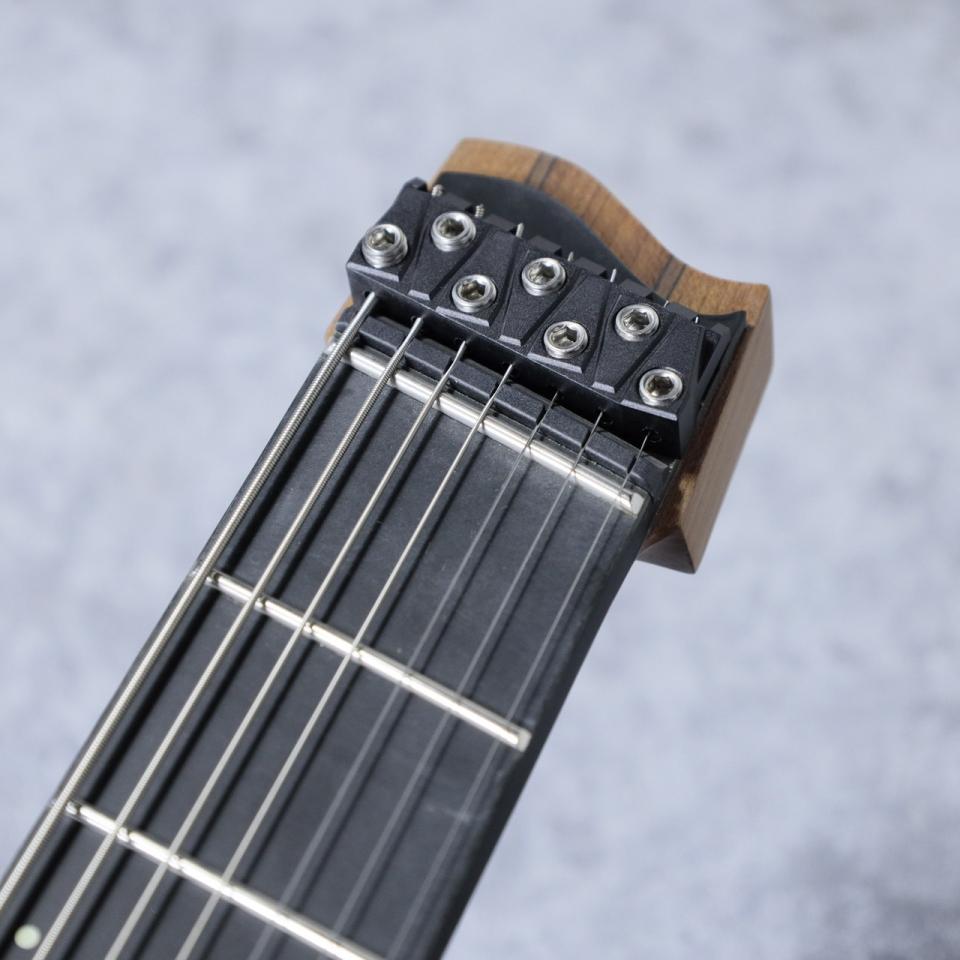 ヘッドレス・ギター特有のチューナーを兼ねたブリッジも同社ならではのアイディアが投入されています。四角いベース・プレート、筒型のパーツ、ノブで構成された各弦独立タイプのオリジナル・ブリッジを採用。ノブを回してチューニングを行い、筒型パーツを前後に移動してオクターブ・ピッチを、さらにネジの頭のようなサドル部を上下にすることで弦高調整がそれぞれ行える。ブリッジは主に軽量なアルミ製で航空関連製品と同等の高い品質を備えており、音の響きに優れている。またネック先端のストリング・ロック部は、六角穴付きのネジを締めて弦をロックする機構です。
