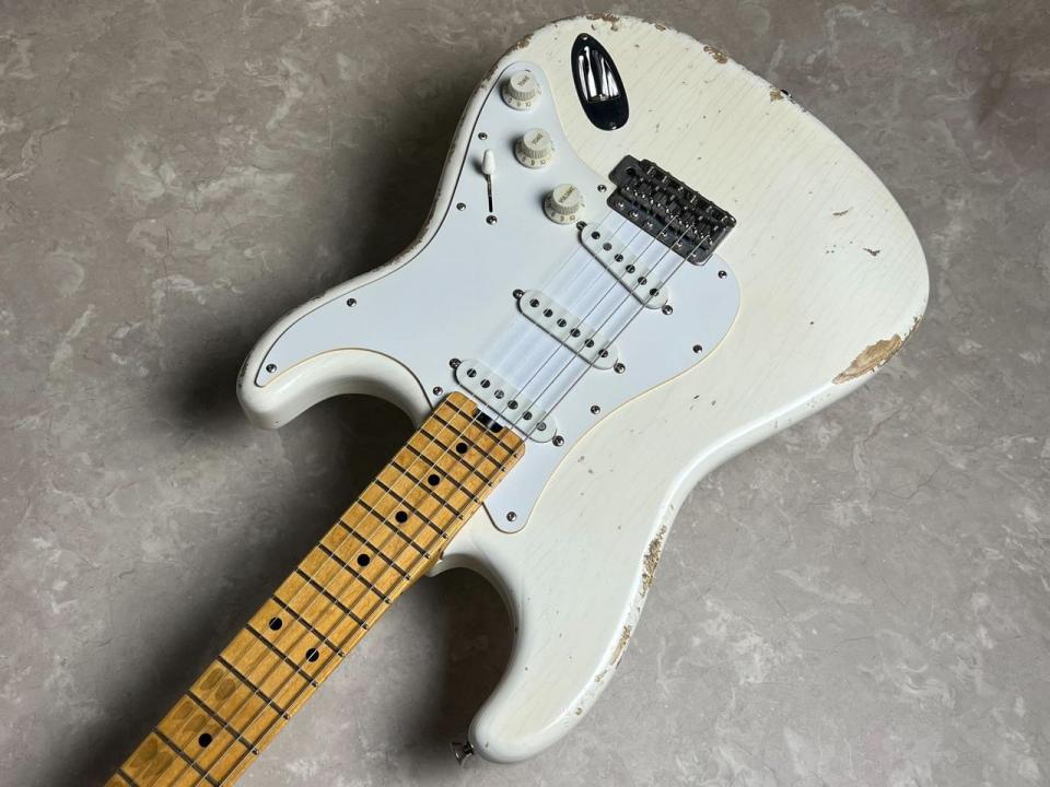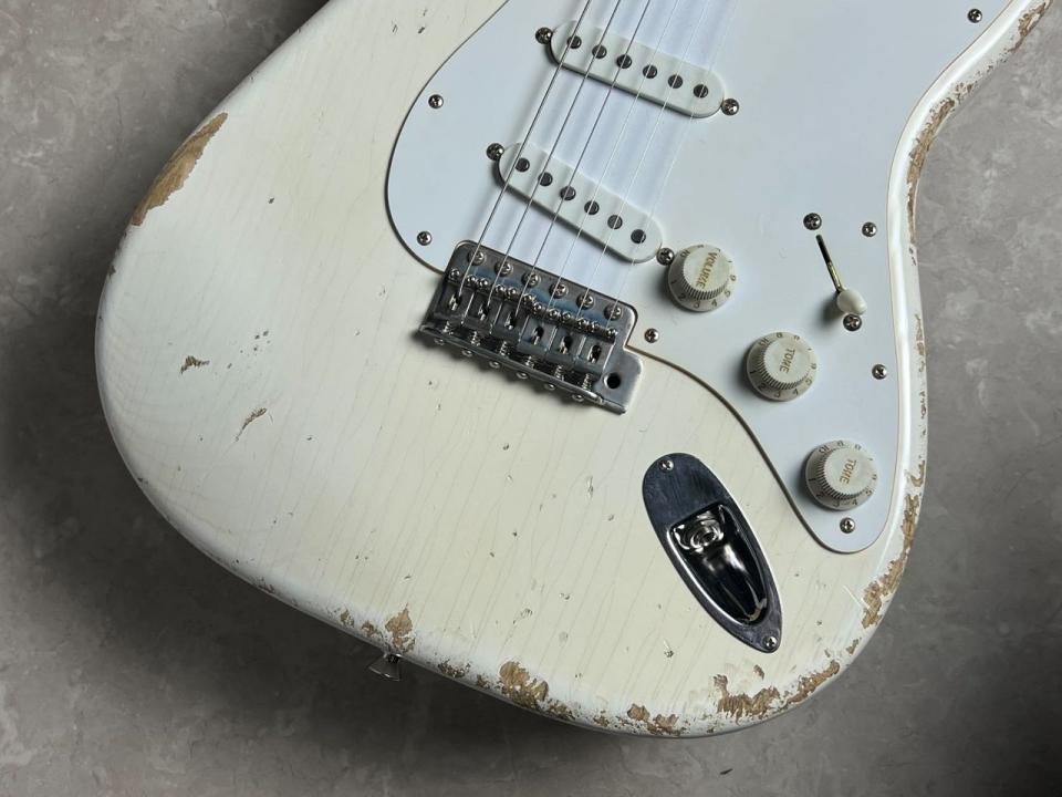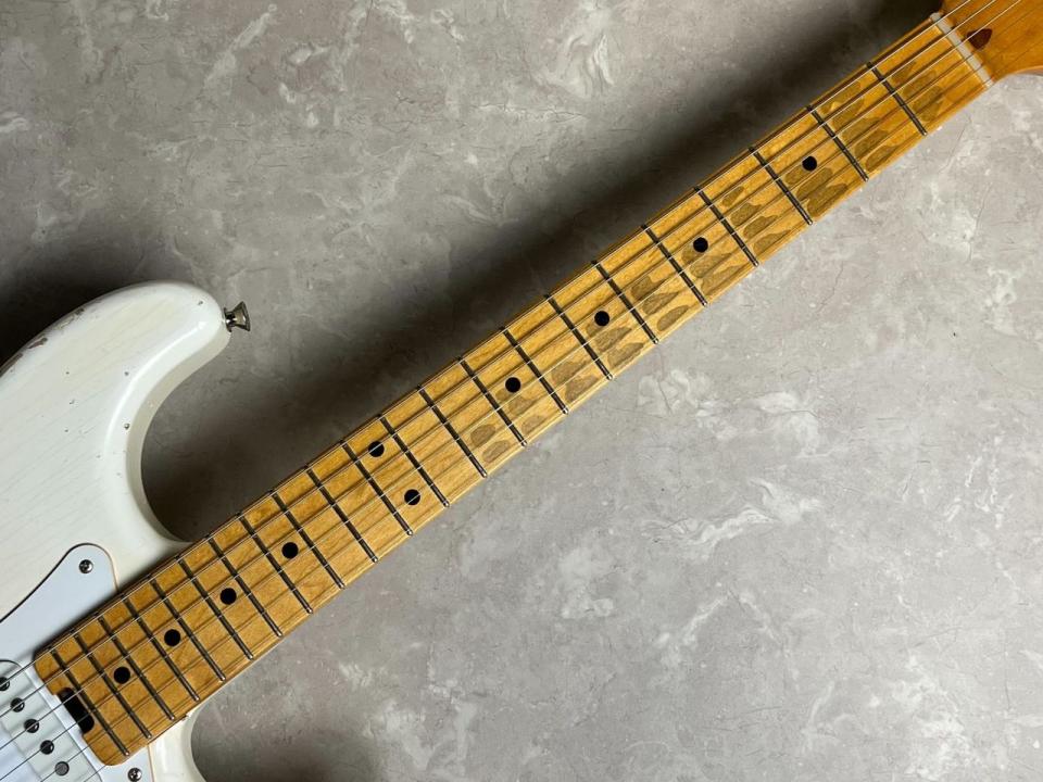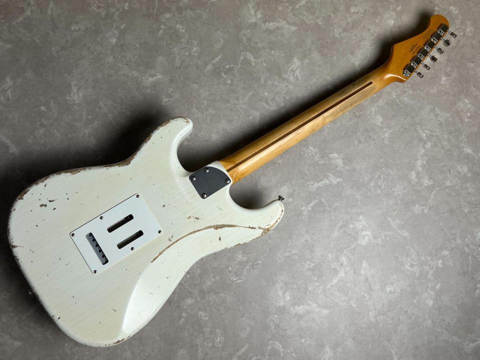 今回入荷したのは50年代のSTタイプを基調に制作されたモデル。ボディには軽量なアッシュ1P、ネックもメイプル1Pにエイジングされたホワイトブロンドの本個体。